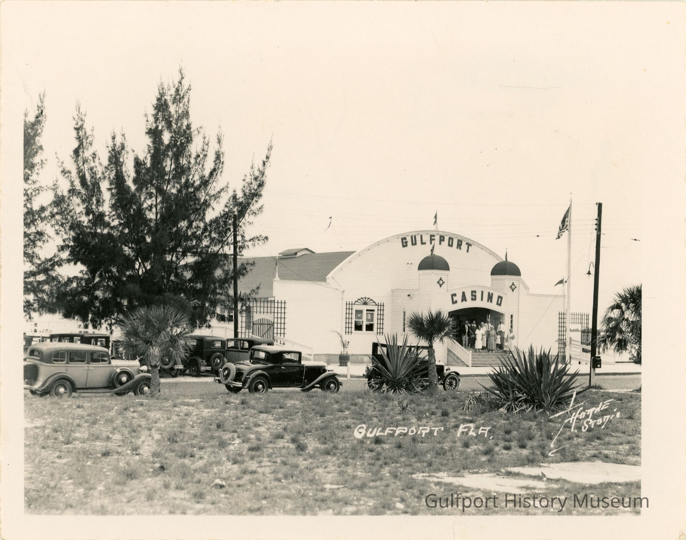 A black and white photograph of the Gulfport Casino from an empty, grassy lot between Shore Blvd and Essex Ave S. People stand on the stairs at the entrance and an American flag is raised on the sidewalk in front of the building. Cars are parked along Shore Blvd.