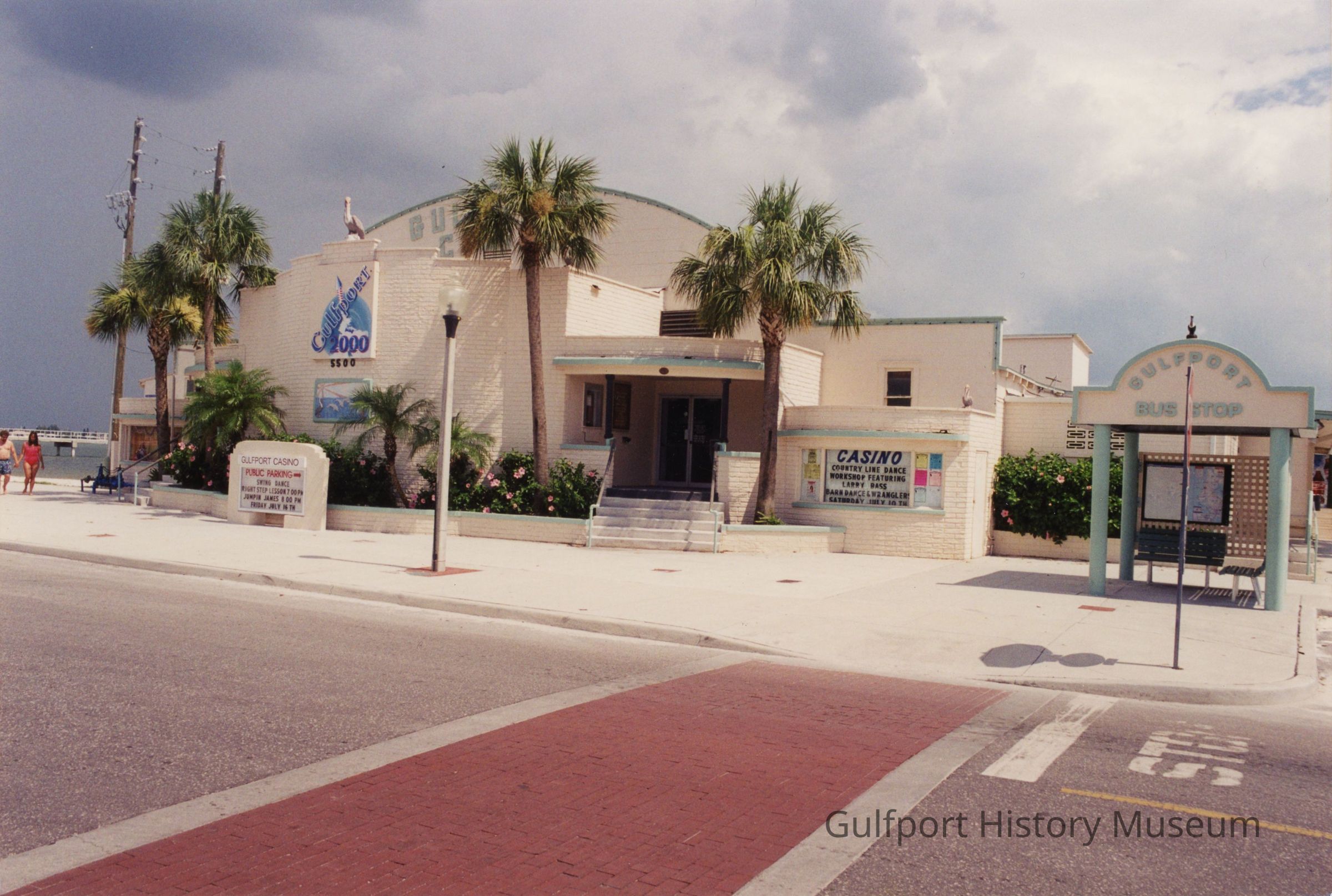 There are palm trees planted around the curvature of the bandstand. There is a sign right of frame on the building which reads "CASINO" and has event details. A sheltered bus stop which reads, "GULFPORT BUS STOP." Two people are walking on the sidewalk. Boca Ciega Bay is slightly visible in the background. The sky is slightly dark.