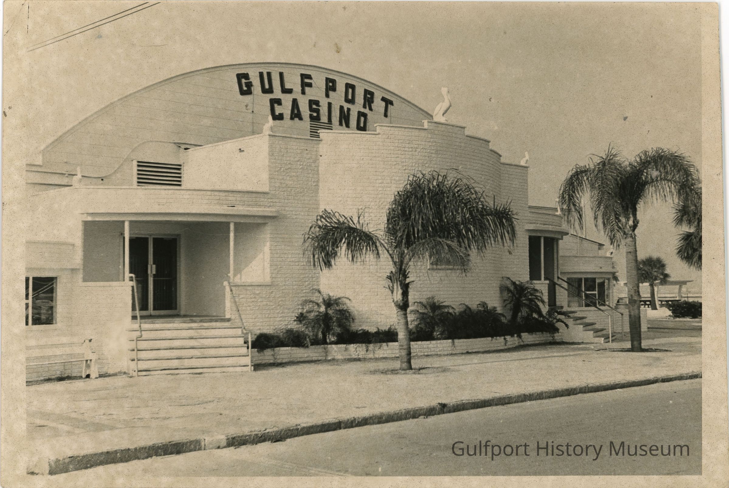 A black and white photograph of the Gulfport Casino following a reconstruction of the front facade and relocation of the interior bandshell. The words "GULFPORT CASINO" are on the top of the building. Two entrances flank the bandstand. There are plants around the front of the building and two palm trees on the sidewalk.