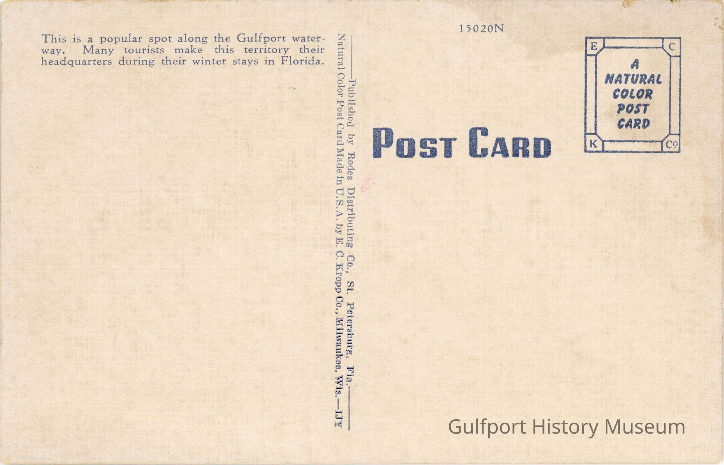 This is a popular spot along the Gulfport water- / way. Many tourists make this territory their / headquarters during their winter stays in Florida.Transcriber