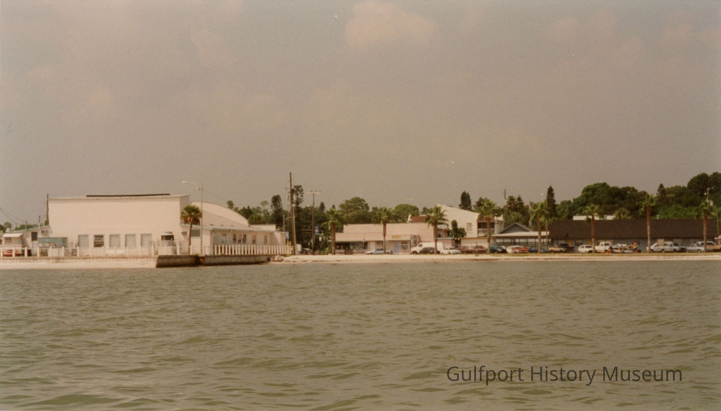 A color photograph of Gulfport Beach from Boca Ciega Bay showing a portion of the southern side of the Gulfport Casino and Shore Blvd, which is lined by buildings and palm trees.