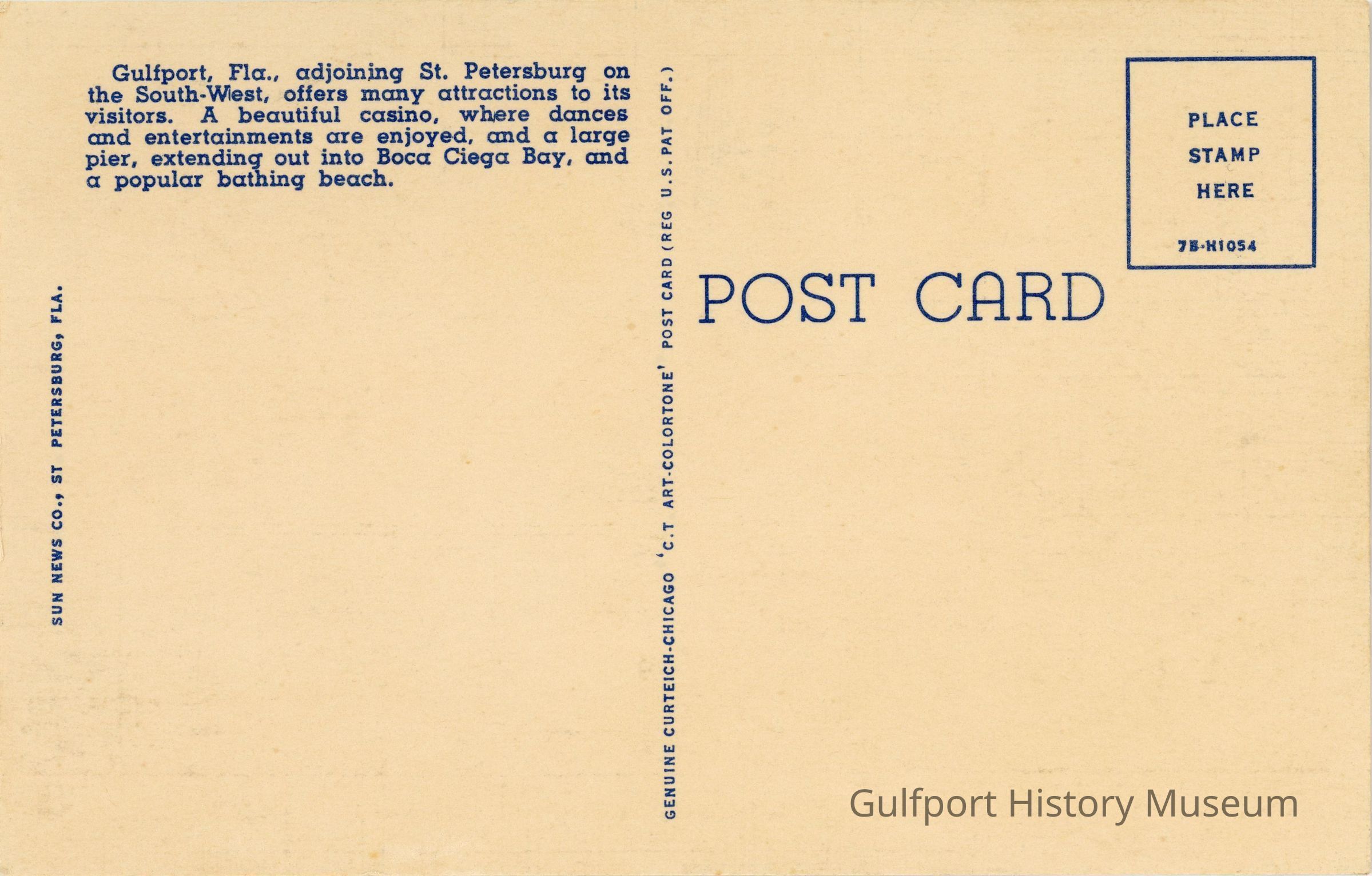 Gulfport, Fla., adjoining St. Petersburg on / the South-West, offers many attractions to its / visitors. A beautiful casino, where dances / and entertainments are enjoyed, and a large / pier, extending out into Boca Ciega Bay, and / a popular bathing beach.Transcriber