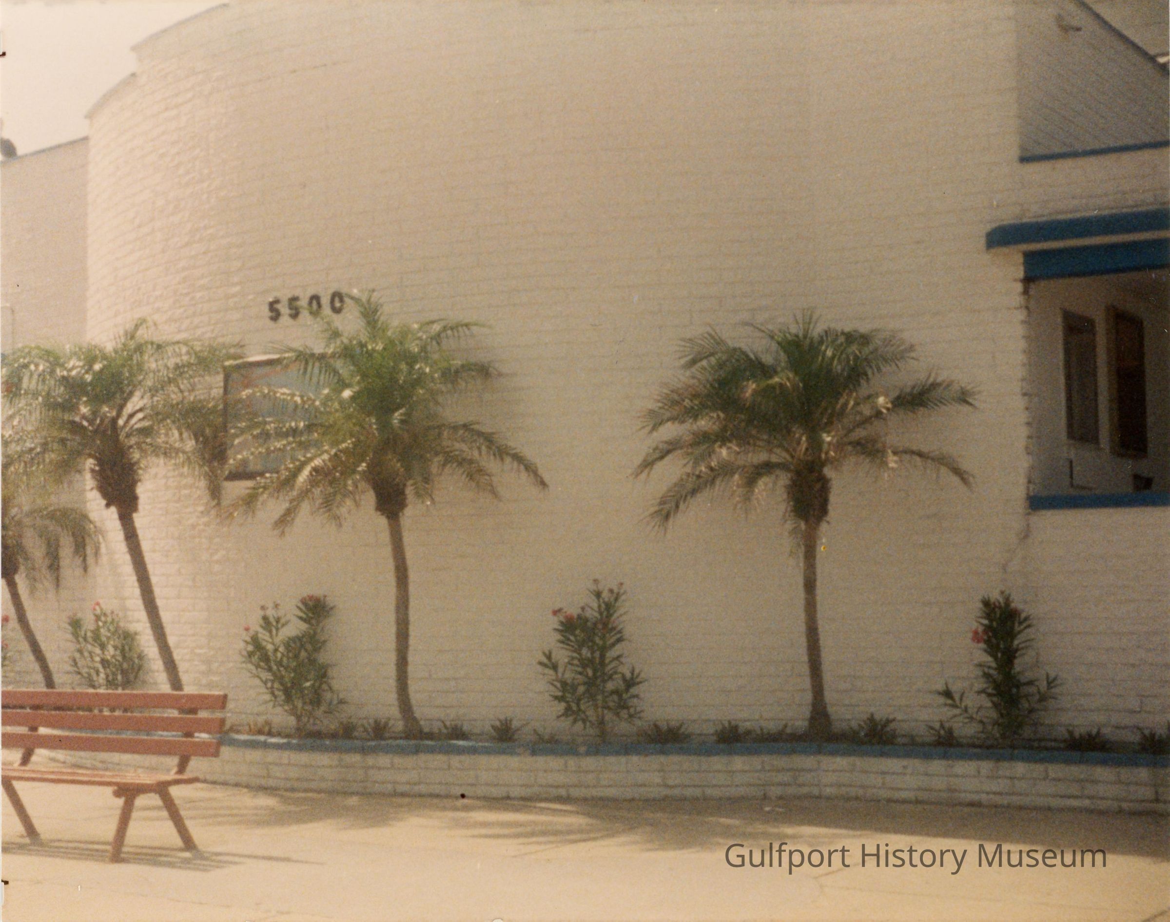 A color photograph of the front of the Gulfport Casino. Palm trees and small flowering bushes are planted along the rounded bandshell. The address "5500" is visible. A bench sits on the sidewalk.