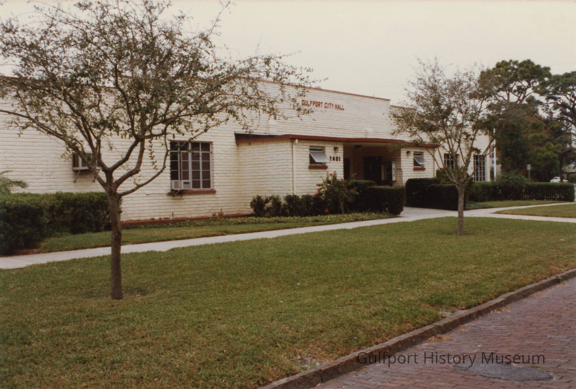 A color photograph of the second Gulfport City Hall from 53 St S. The white brick building was built and dedicated in 1953 and reads "GULFPORT CITY HALL" above the main entrance. Two trees have been planted on the easement between the building and the street.