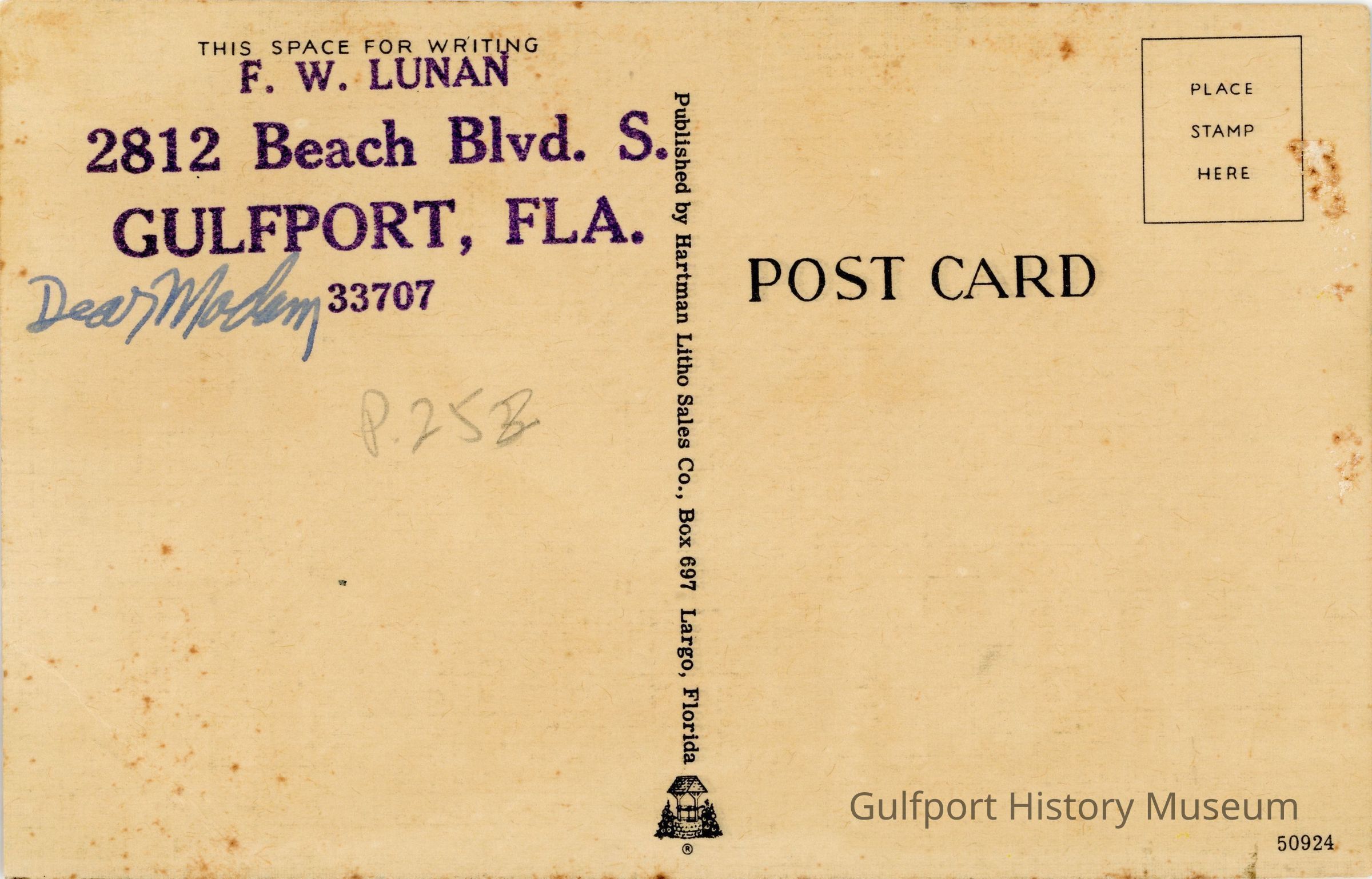F. W. LUNAN / 2812 Beach Blvd. S. / GULFPORT, FLA. / 33707 / Dear Madam / P. 25B /Transcriber