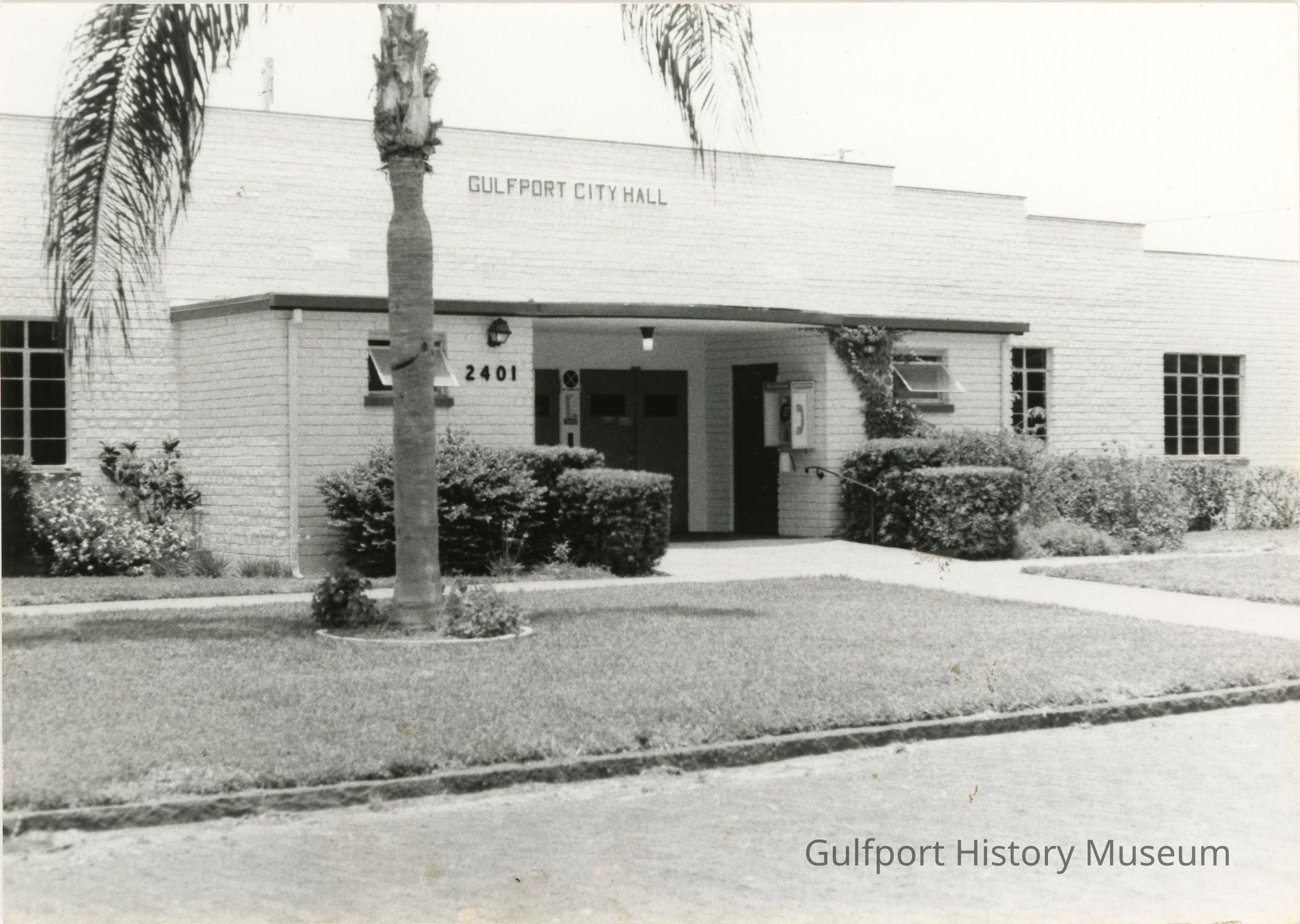 A black and white photograph of the second Gulfport City Hall from 53 St S. The white brick building was built and dedicated in 1953 and has a sign which reads "GULFPORT CITY HALL" above the main entrance. One palm tree stands in front. The building number reads "2401."