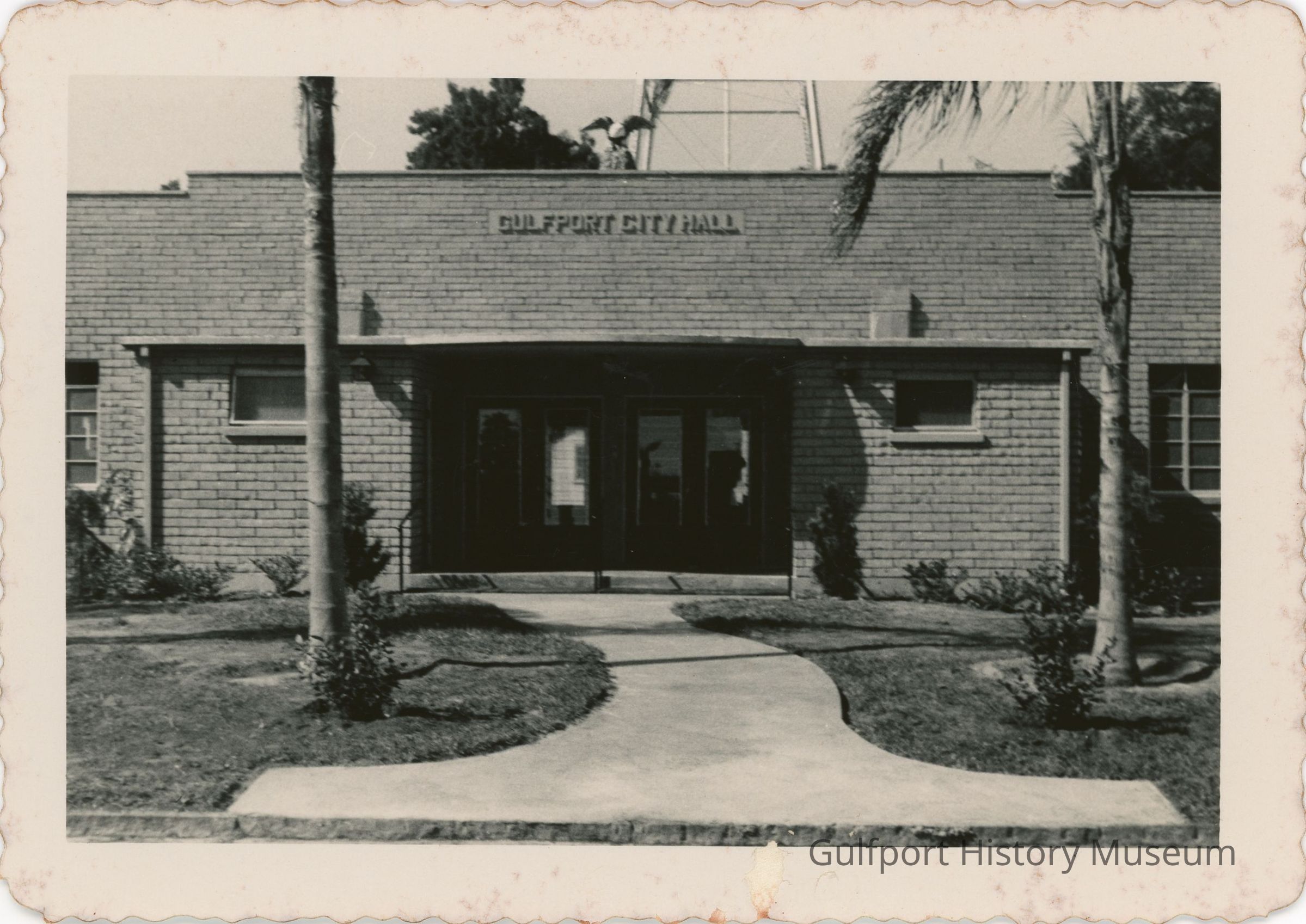 A black and white photograph of the second Gulfport City Hall from 53 St S. The white brick building was built and dedicated in 1953 and has a statue of an eagle above the sign which reads "GULFPORT CITY HALL." There are two palm trees on either side of a wavy walkway leading up to the main entrance.