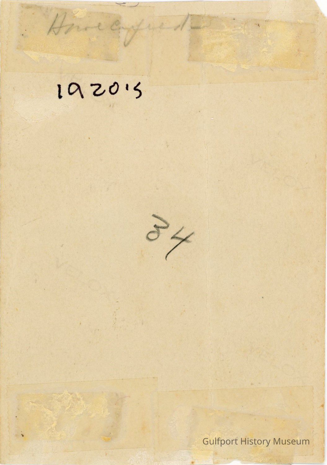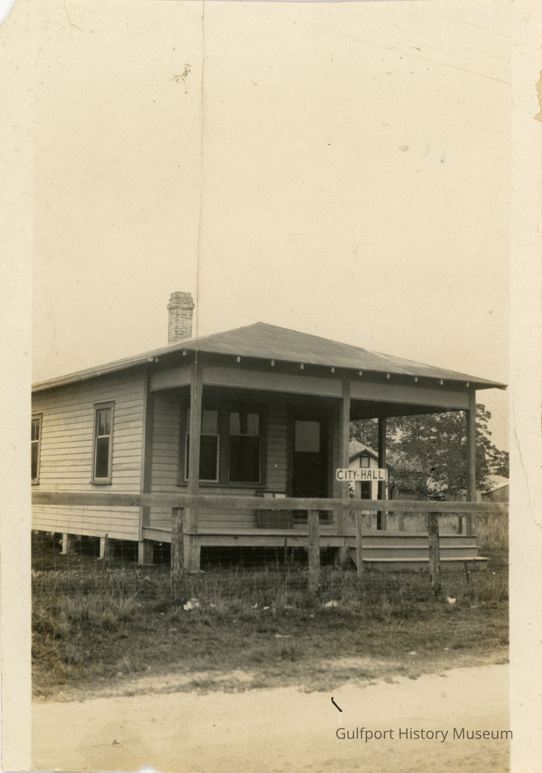 A black and white photograph of the first temporary Gulfport City Hall building with a sign attached to the front porch which reads, "CITY-HALL." The building was formerly a real estate office which was converted to work as city hall prior to the construction of the first city hall in 1913. The building is surrounded by a wire fence.