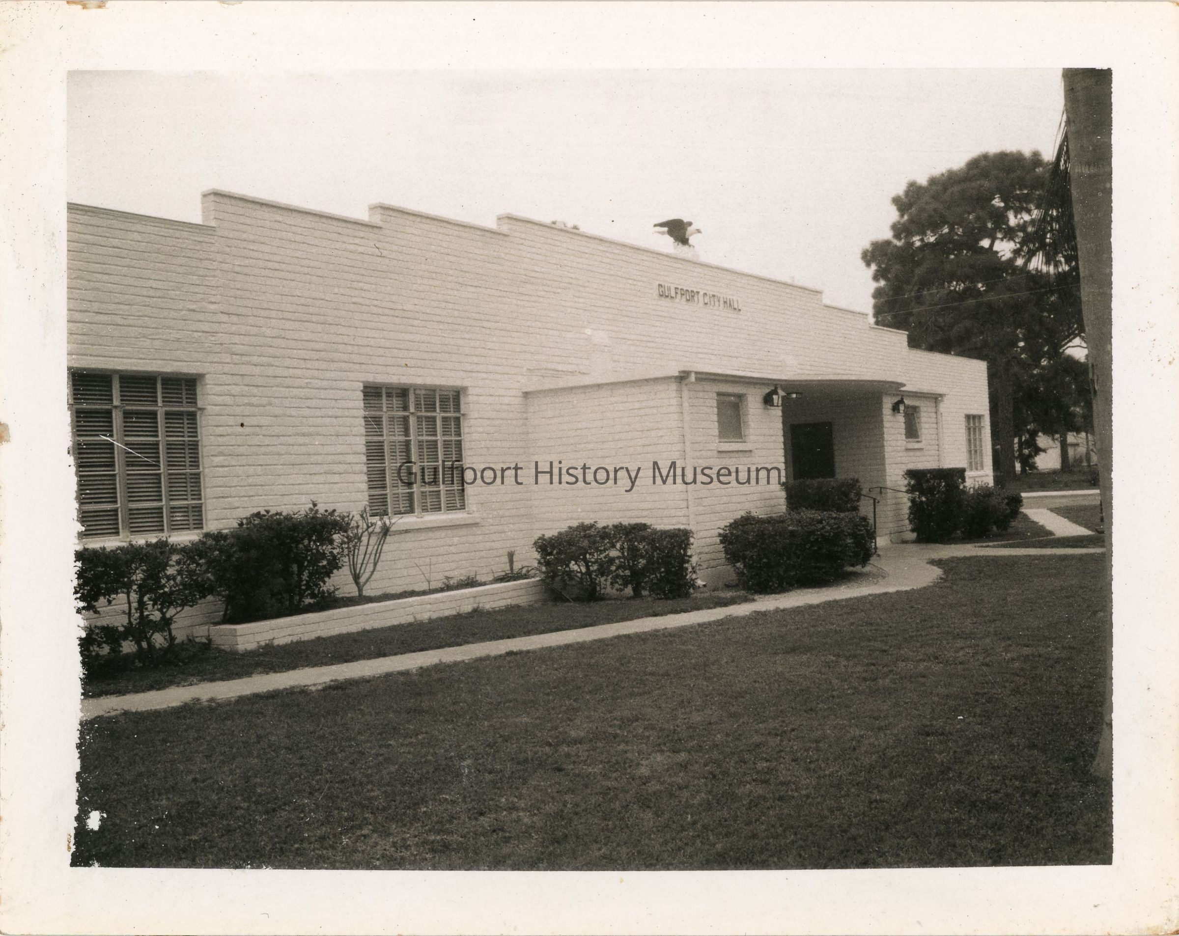 A black and white photograph of the second Gulfport City Hall from 53 St S. The white brick building was built and dedicated in 1953 and has a statue of an eagle above the sign which reads "GULFPORT CITY HALL." The trunk of a palm tree is slightly visible right of frame.