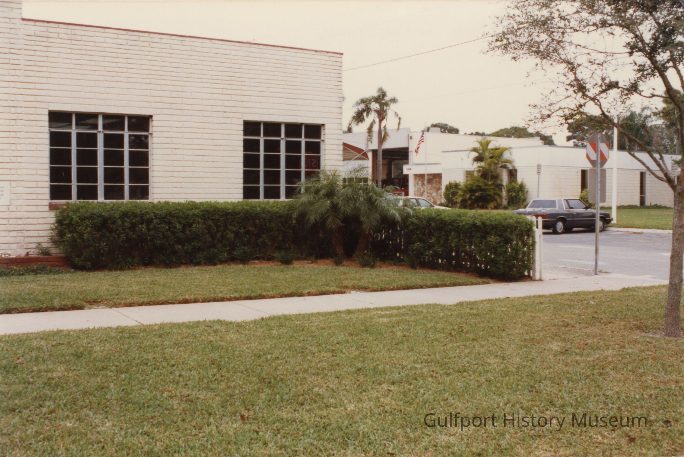 A color photograph of the second Gulfport City Hall building taken from 53rd St S. Beyond the corner of the building is the Police Station. There are a few cars parked in the parking lot in between the two buildings. An American flag is on the flag pole outside of the Police Station.