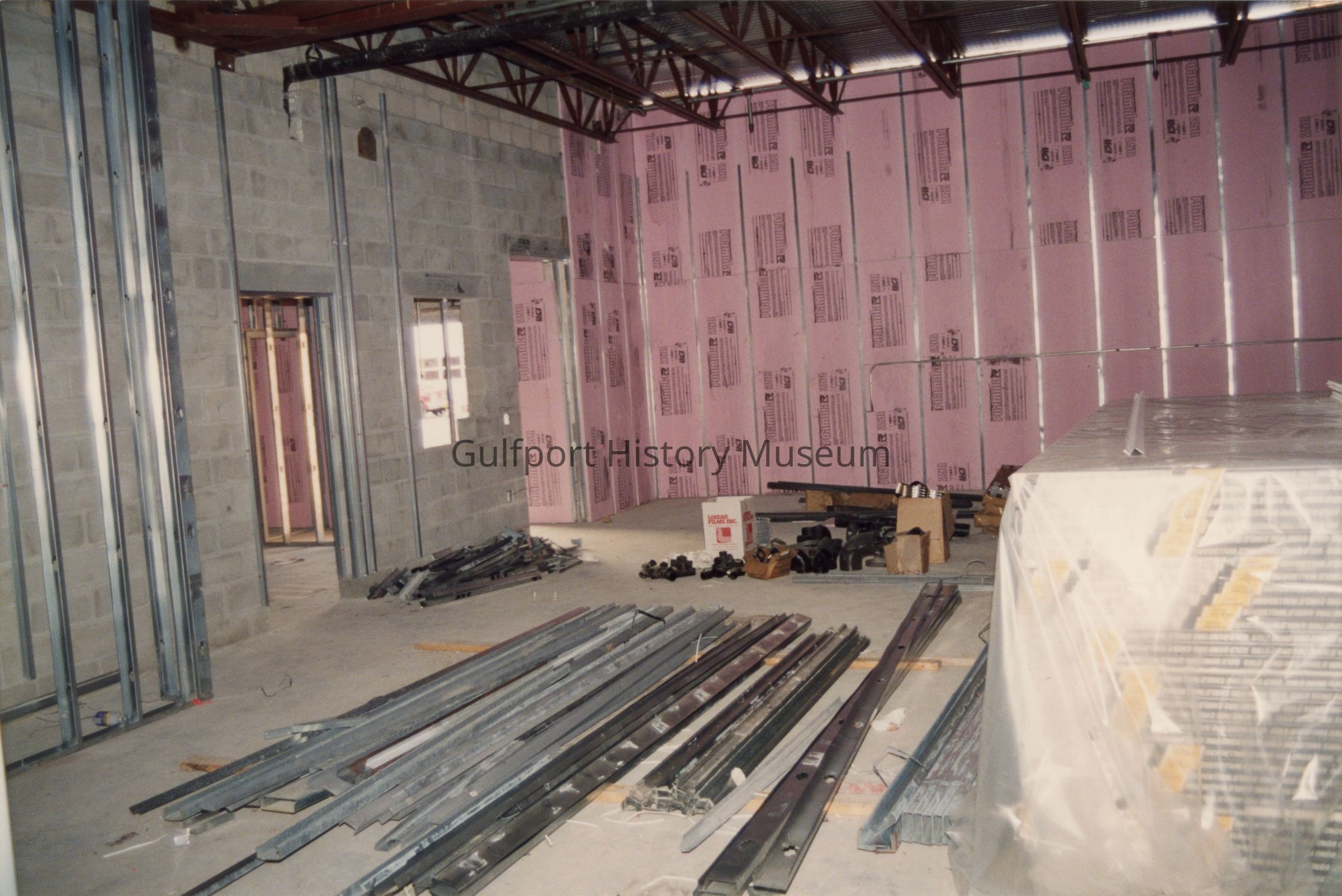 A color photograph of the interior of a City Hall Complex building (?) during its construction. Metal studs and tracks are out on the concrete floor, with sections of walls insulated with pink foam board. Multiple doorways are visible within the gray block walls under a high metal ceiling.