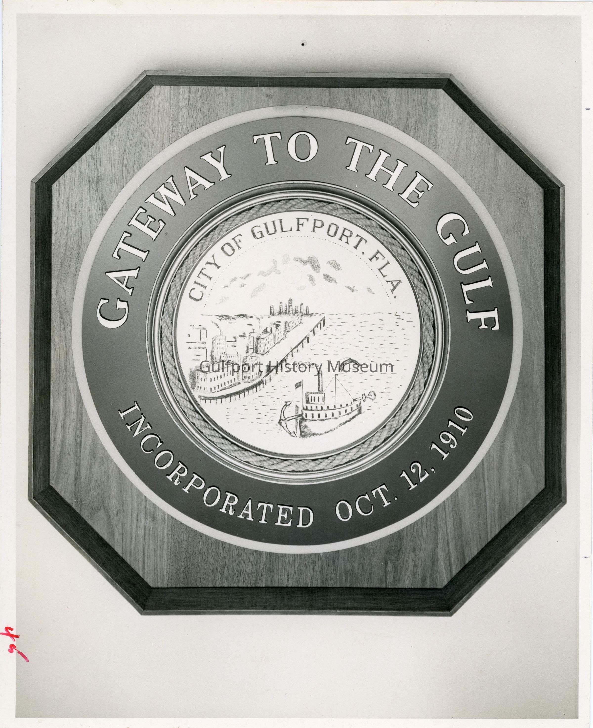 A black and white photograph of the Seal of Gulfport hanging in City Hall. It features an idealized illustration of Gulfport with a ship in the water of Boca Ciega Bay and large city in the background (presumably St. Petersburg). It reads: