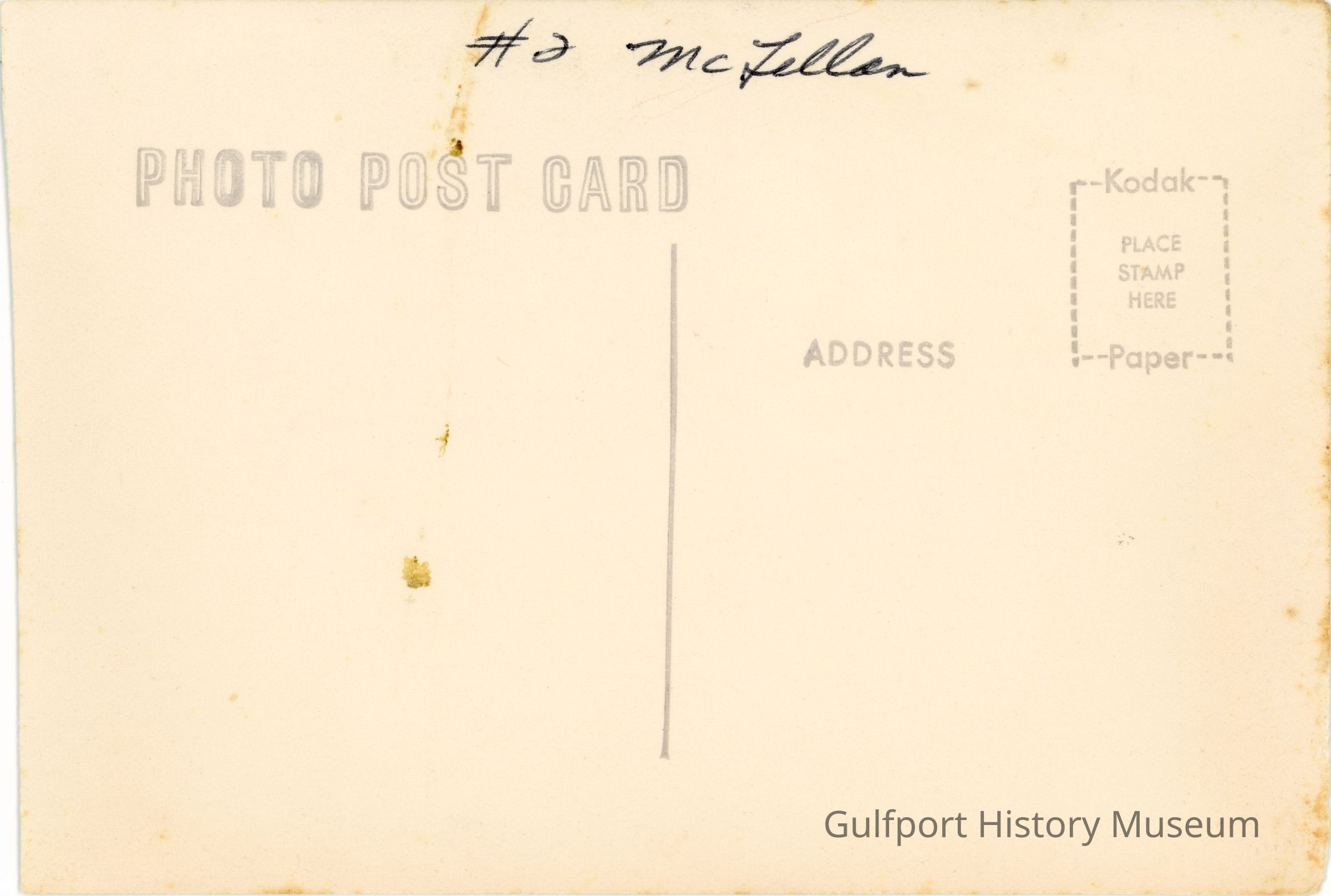 A black and white photograph postcard of the Gulfport Clinic with Dr. Grace McLellan and Dr. Colin McLellan standing outside near the front door. The clinic is a two story building with a screened in porch taking up most of the front half of the second story and is well landscaped. There is a sign in front near the sidewalk that reads: