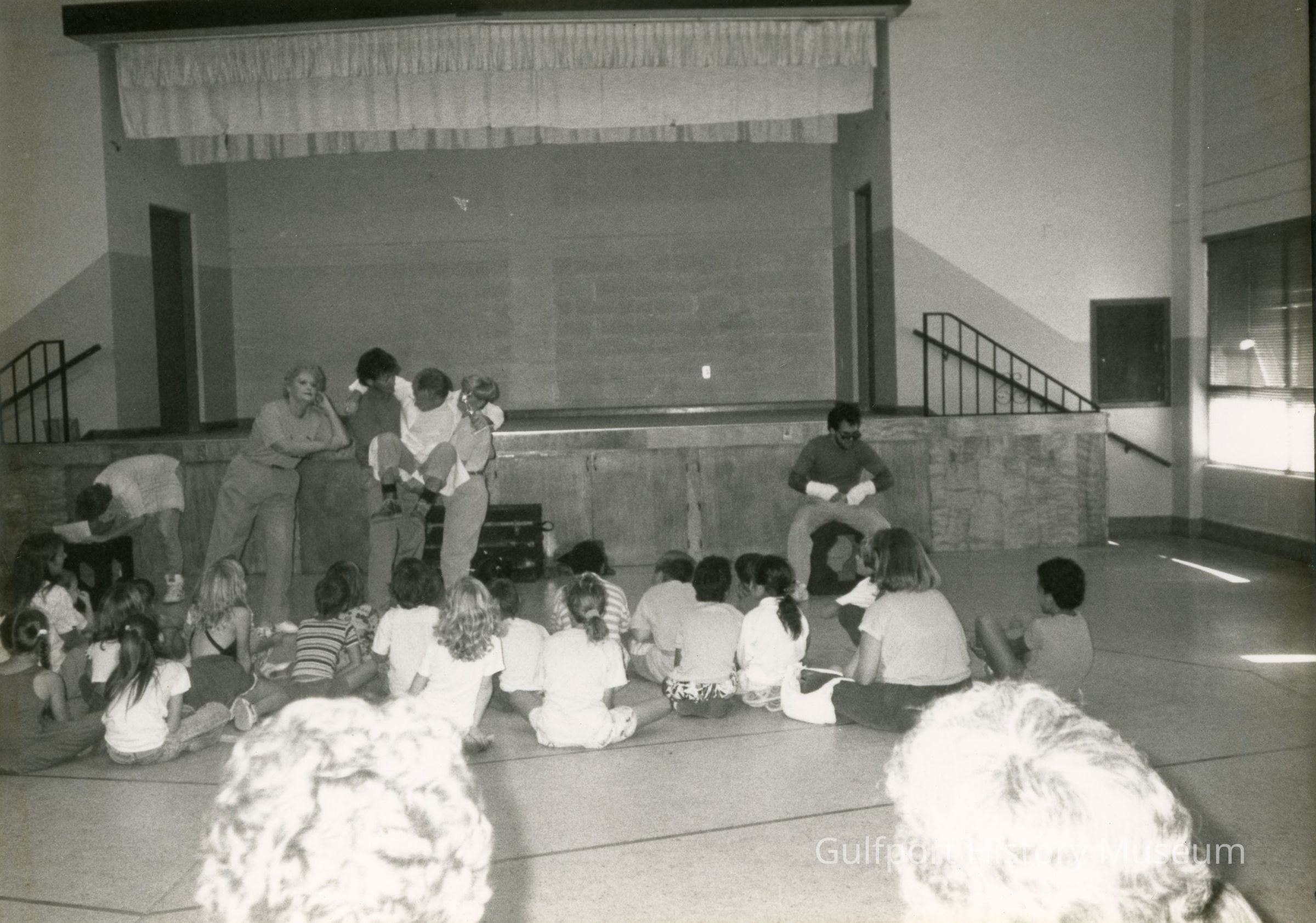 A black and white photograph of a group of children watching a performance at the Gulfport Community Center (later renamed Gulfport Recreation Center).
