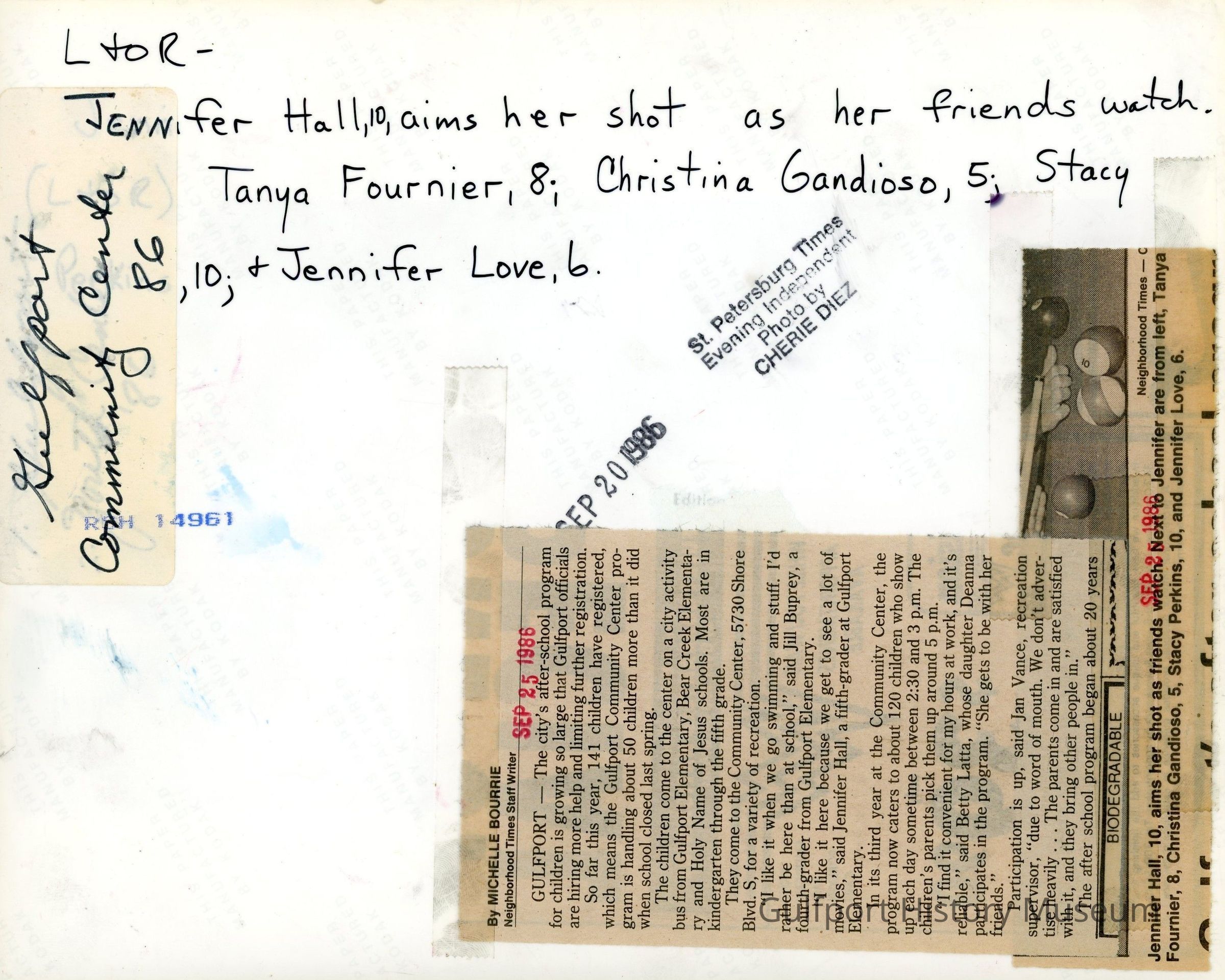 Jennifer Hall, 10, aims her shot as her friends watch. Tanya Fournier, 9; Christina Gandioso, 5; Stacy Perkins, 10; + Jennifer Love, 6.Language