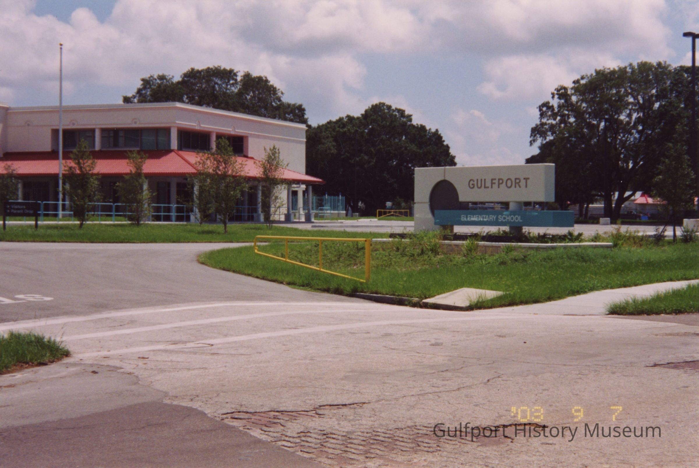 A color photograph of the exterior of the Gulfport Elementary School building and sign from 52nd St S.