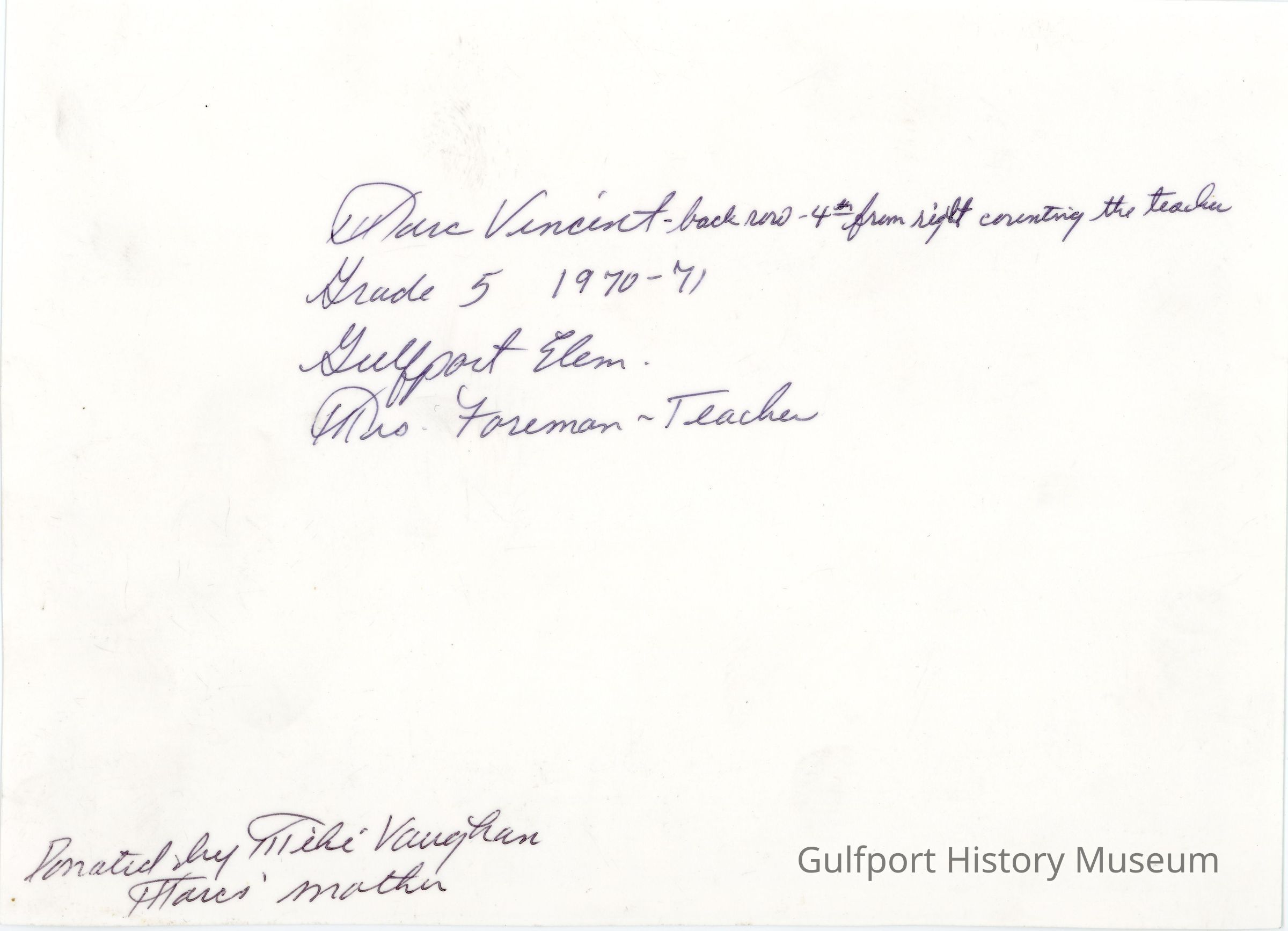 Marc Vincent - back row - 4th from right counting the teacher Grade 5 1970-71 Gulfport Elem. Mrs. Foreman - Teacher Donated by Miki Vaughan Marc's mother