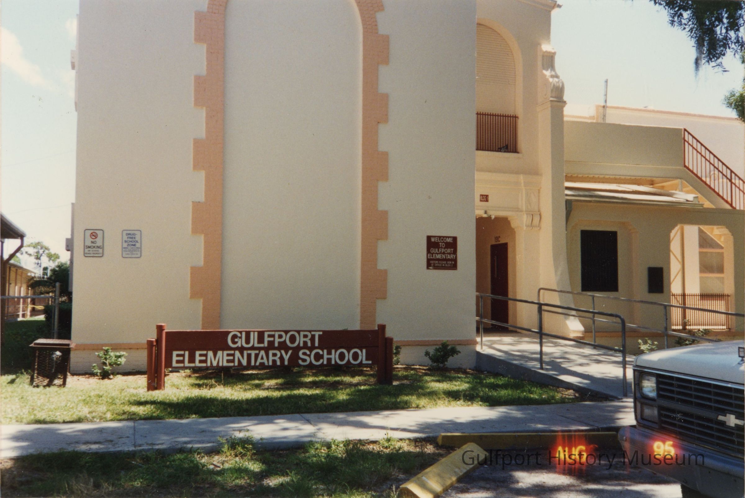 A color photograph of the exterior of the original Gulfport Elementary School building and sign.