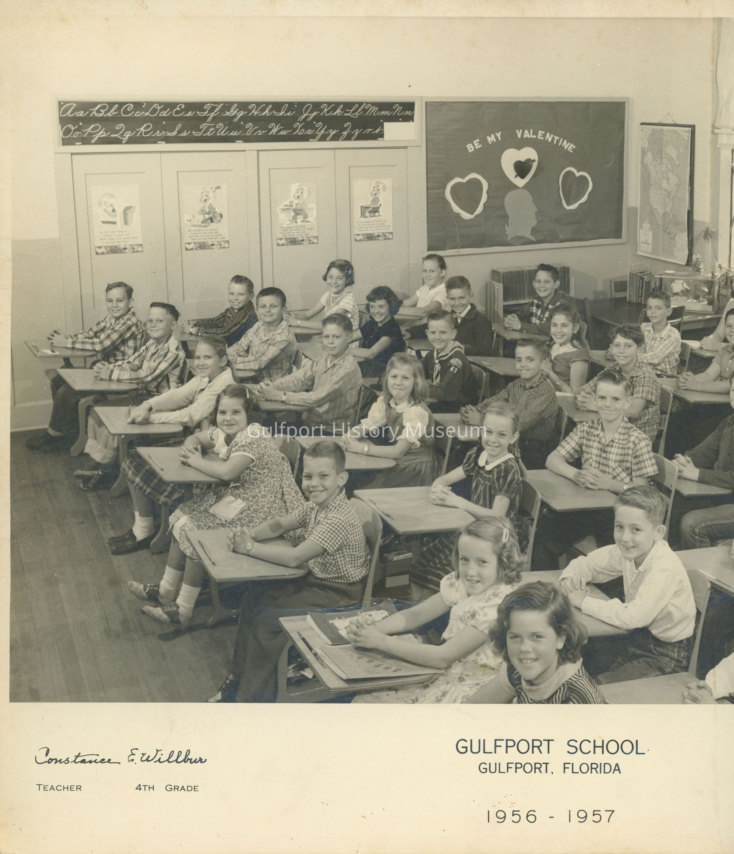 A black and white photograph of Constance E. Willbur's 4th grade class at Gulfport Elementary School for the 1956-1957 school year.