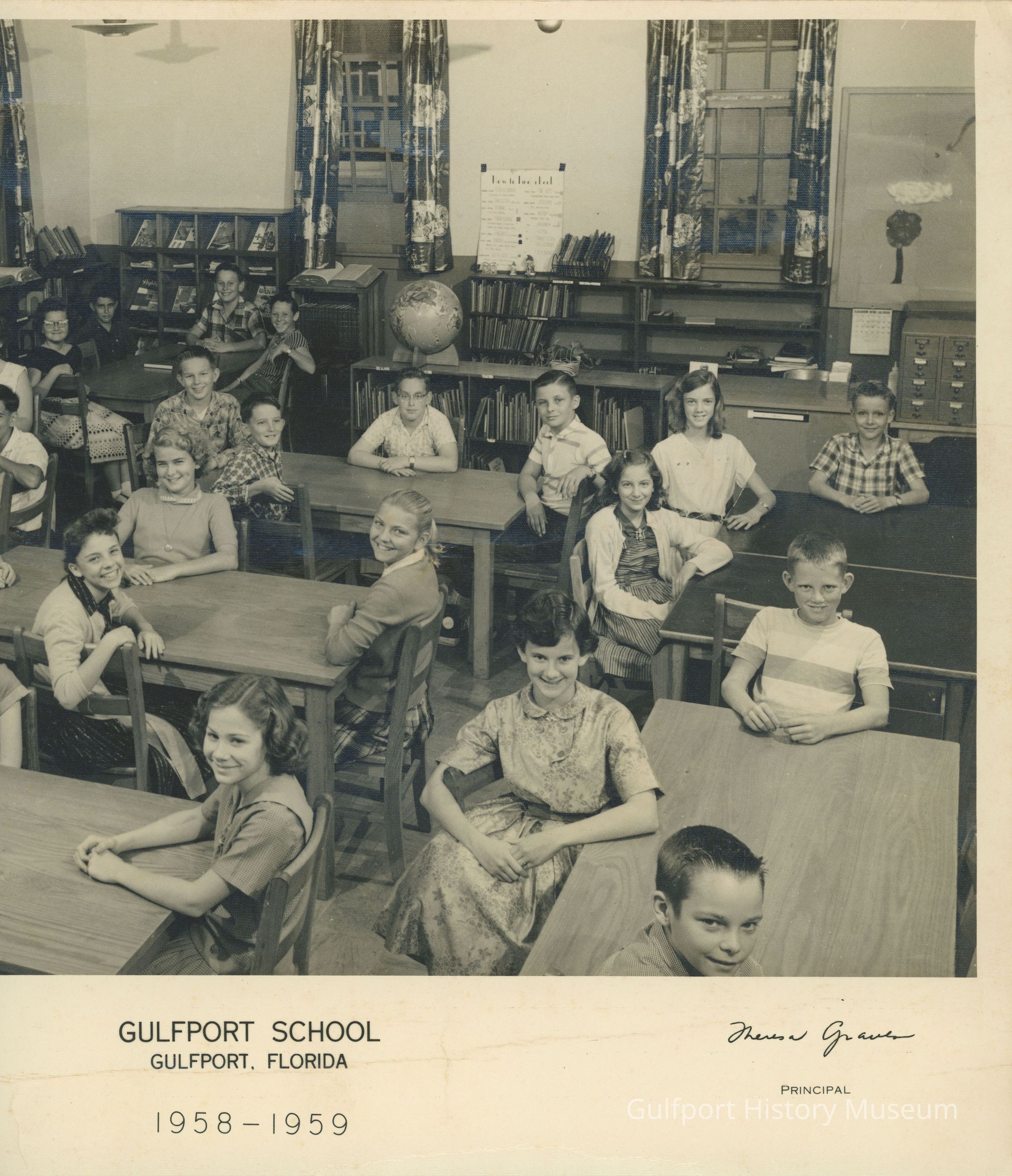 A black and white photograph of Elizabeth Dame's 6th grade class at Gulfport Elementary School for the 1958-1959 school year. The reverse features an illustration of two children and a dog walking towards a small schoolhouse and a blank Roll Call list.