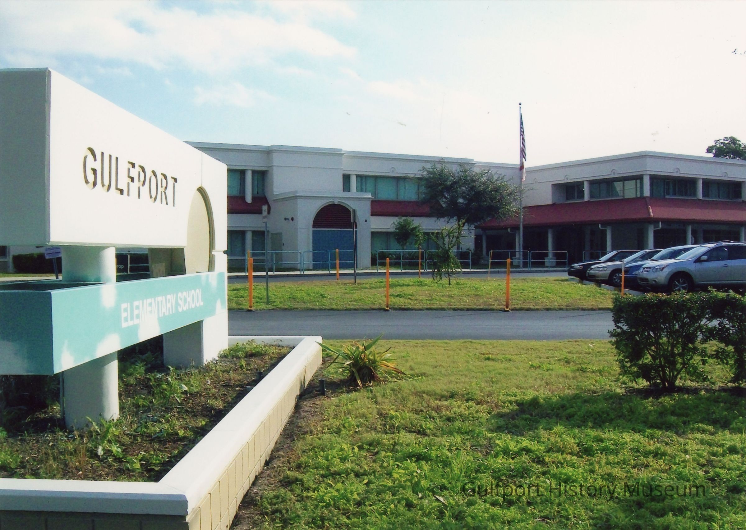 A color photograph of the exterior of the Gulfport Elementary School building and sign.
