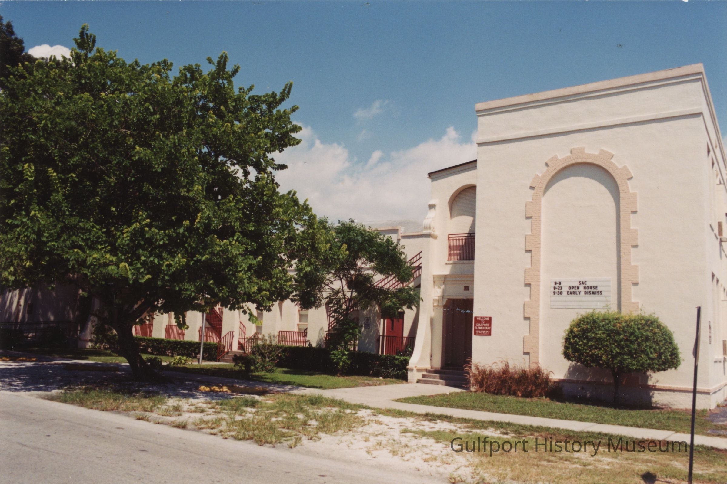 A color photograph of the exterior of the original Gulfport Elementary School building.