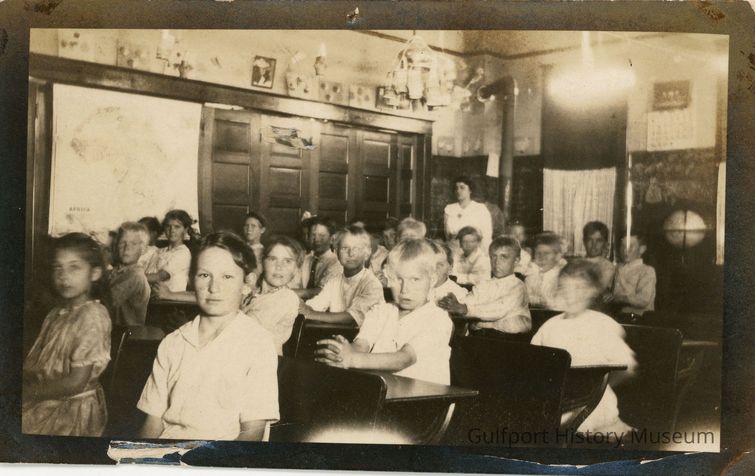 A black and white photograph of students in a classroom at [Gulfport Elementary School].