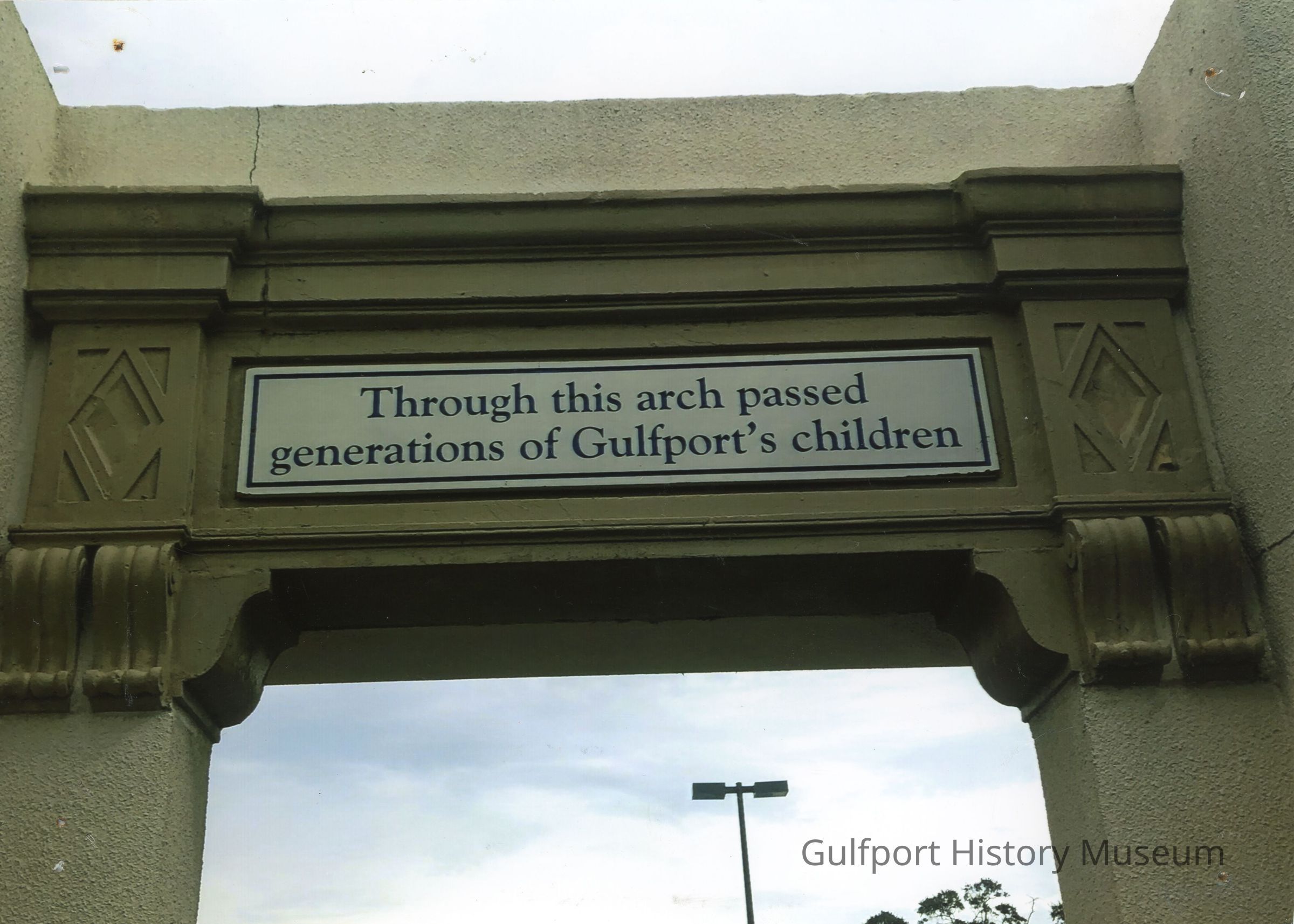 A color photograph of the archway of the original Gulfport Elementary School building which stands in front of the 2003 building. A sign on the arch reads, "Through this arch passed generations of Gulfport's children."