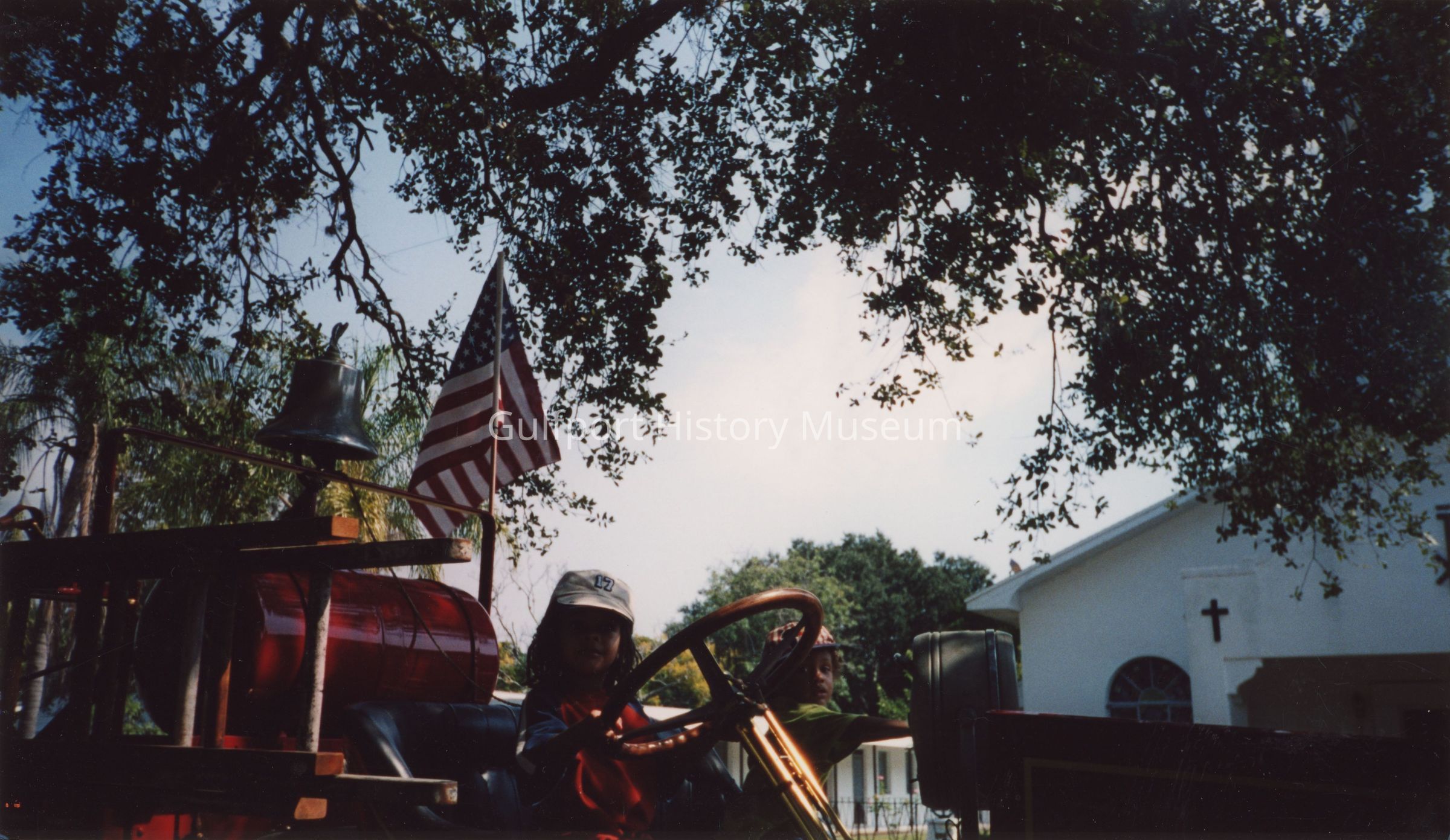 A color photograph of two children sitting in a 1925 American La France Model 75 pumper. The vehicle is bright red and features a silver bell and an American flag. The First United Methodist Church on 53rd St S is visible in the background.