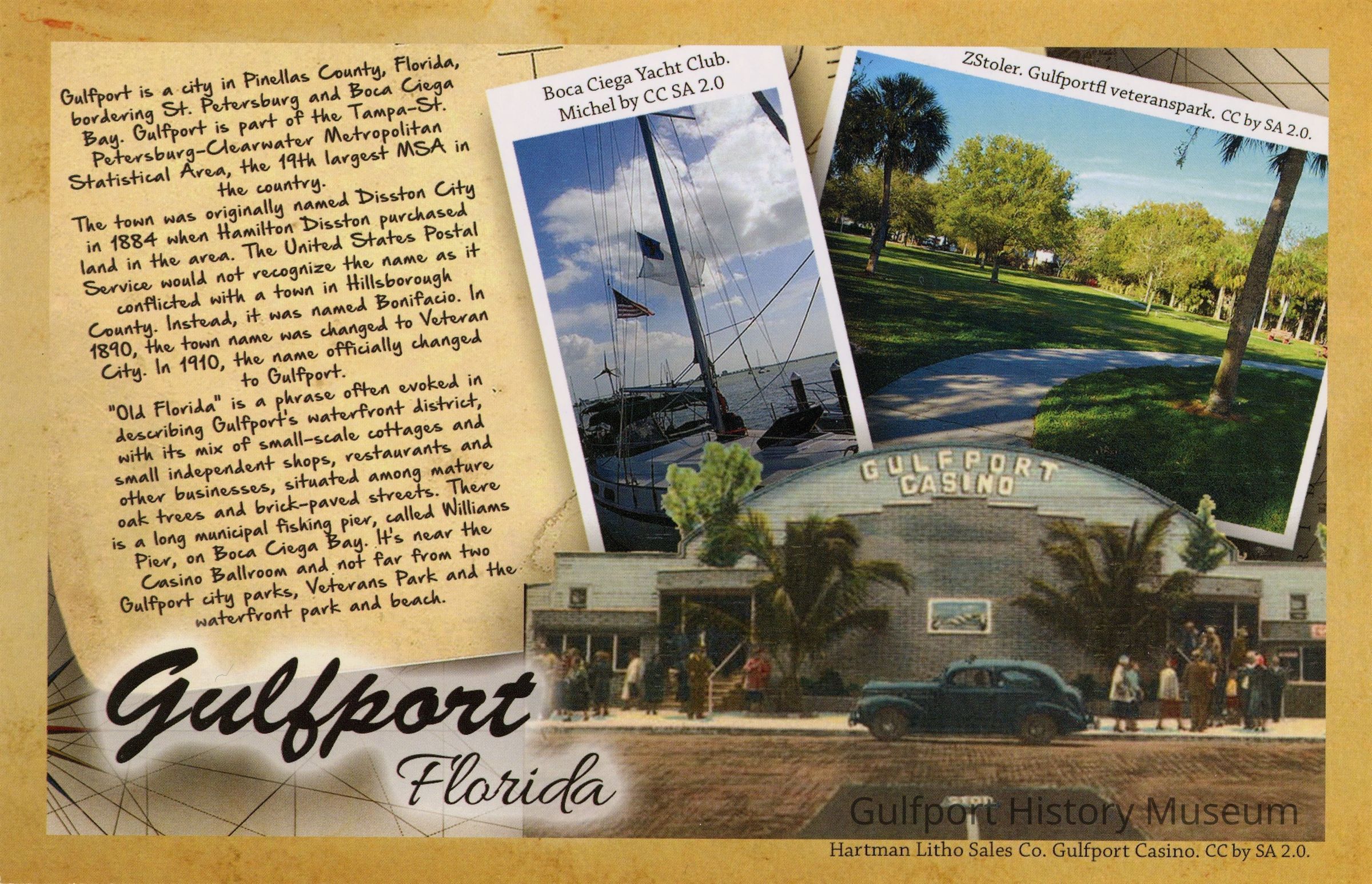 The town was originally named Disston City in 1884 when Hamilton Disston purchased land in the area. The United States Postal Service would not recognize the name as it conflicted with a town in Hillsborough County. Instead, it was named Bonifacio. In 1890, the town name was changed to Veteran City. In 1910, the name officially changed to Gulfport. "Old Florida" is a phrase often evoked in describing Gulfport's waterfront district, with its mix of small-scale cottages and small independent shops, restaurants, and other businesses, situated among mature oak trees and brick-paved streets. There is a long municipal fishing pier, called Williams Pier, on Boca Ciega Bay. It's near the Casino Ballroom and not far from two Gulfport city parks, Veterans Park and the waterfront park and beach.Transcriber