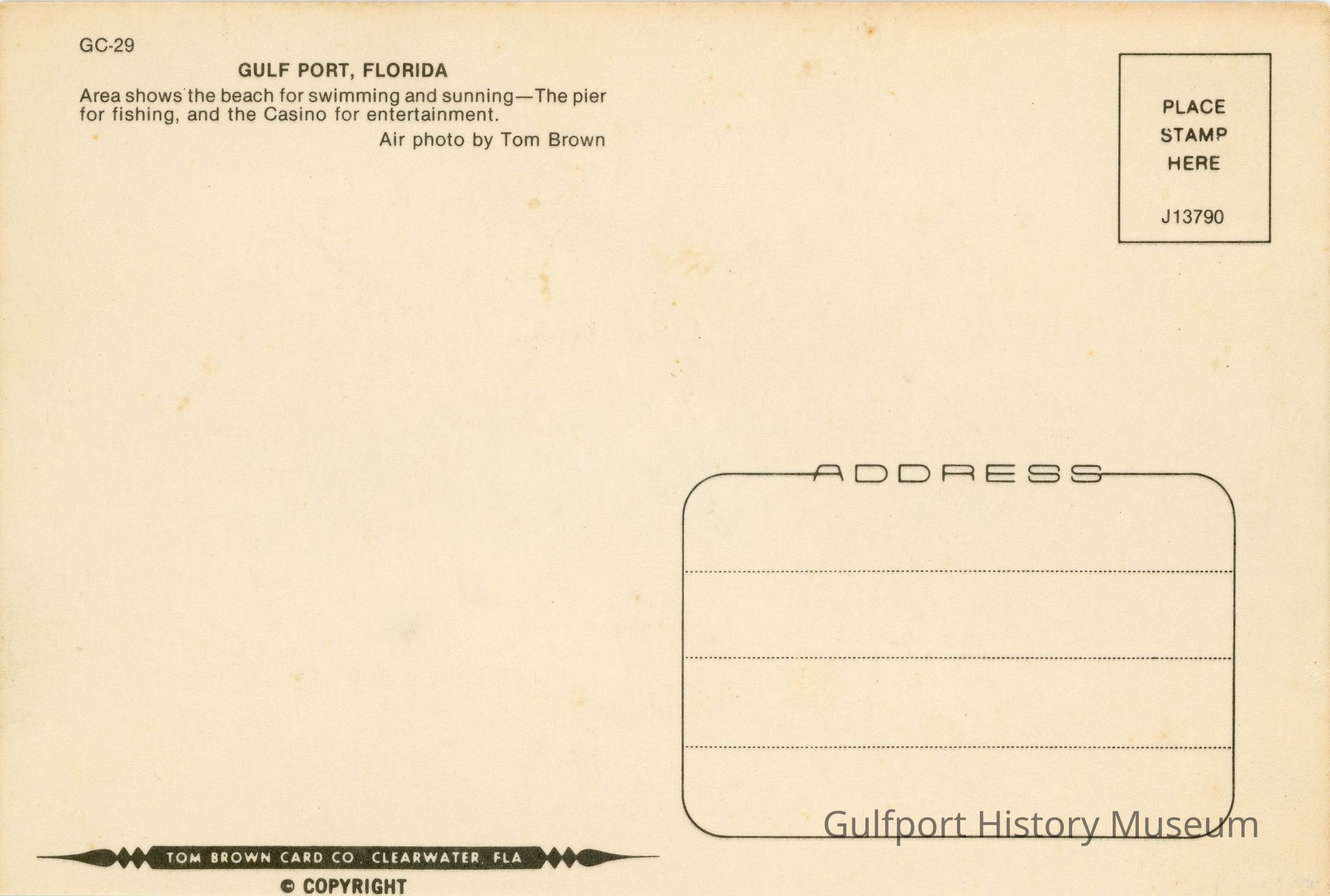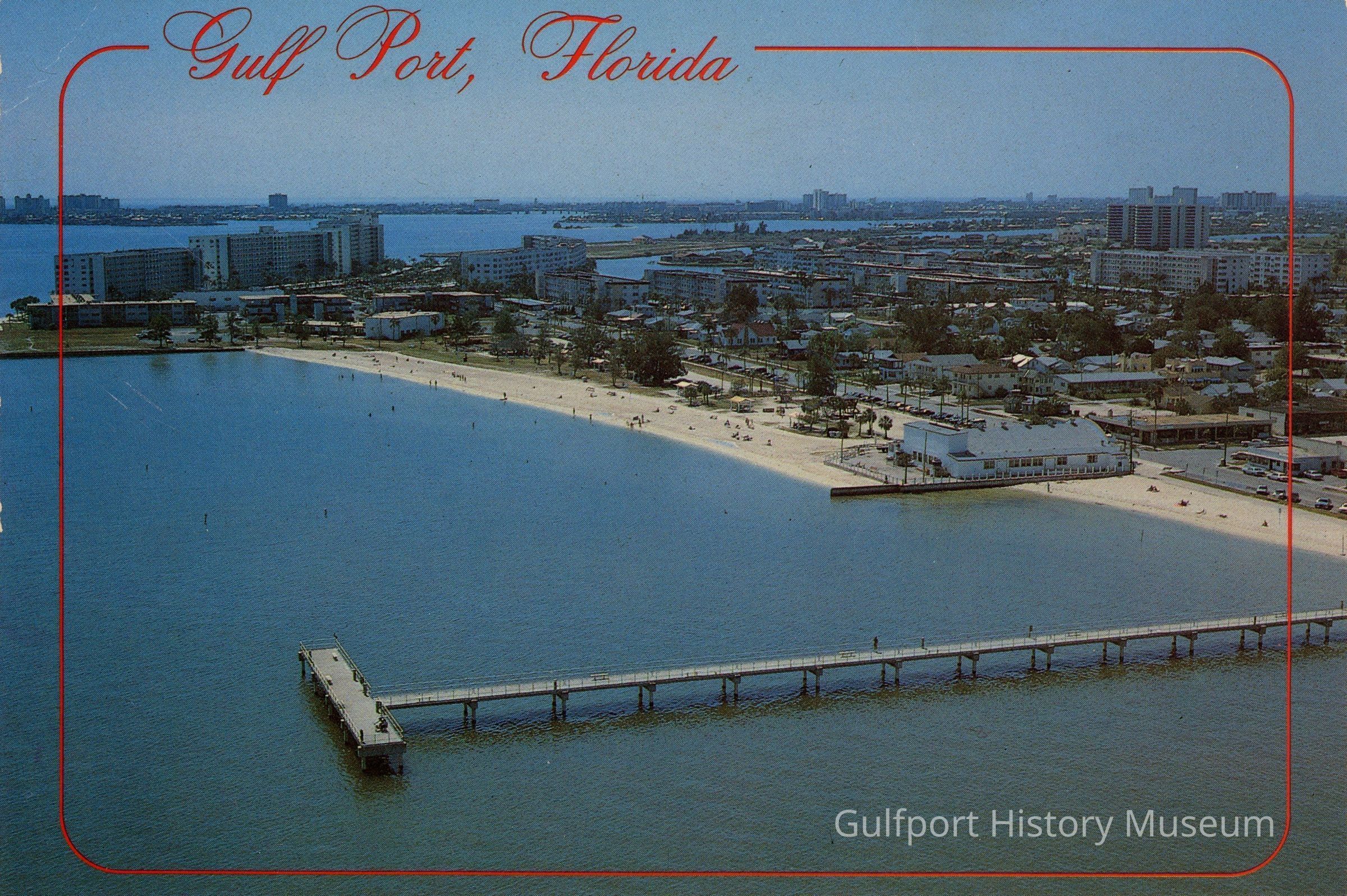 A scan of a color photochrome postcard showing a low aerial view of the Gulfport shore on Boca Ciega Bay, featuring the pier, Casino, Gulfport Beach, and Town Shores.Subject
