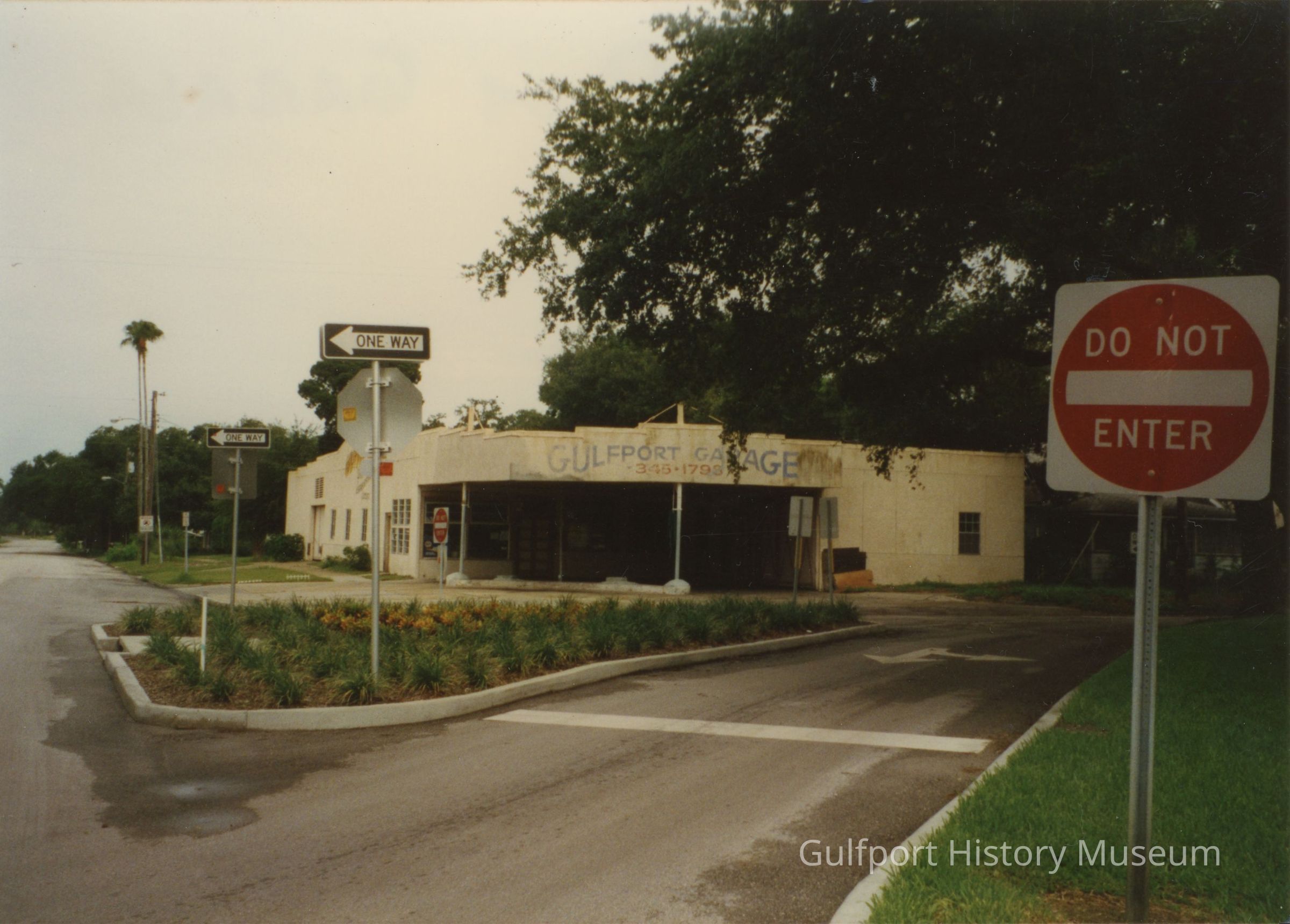 A color photograph of Gulfport Garage taken from across the street. There are several prominent road signs in the foreground. The blue "GULFPORT GARAGE" painted on the front entrance is visible but partially obscured by a tree.