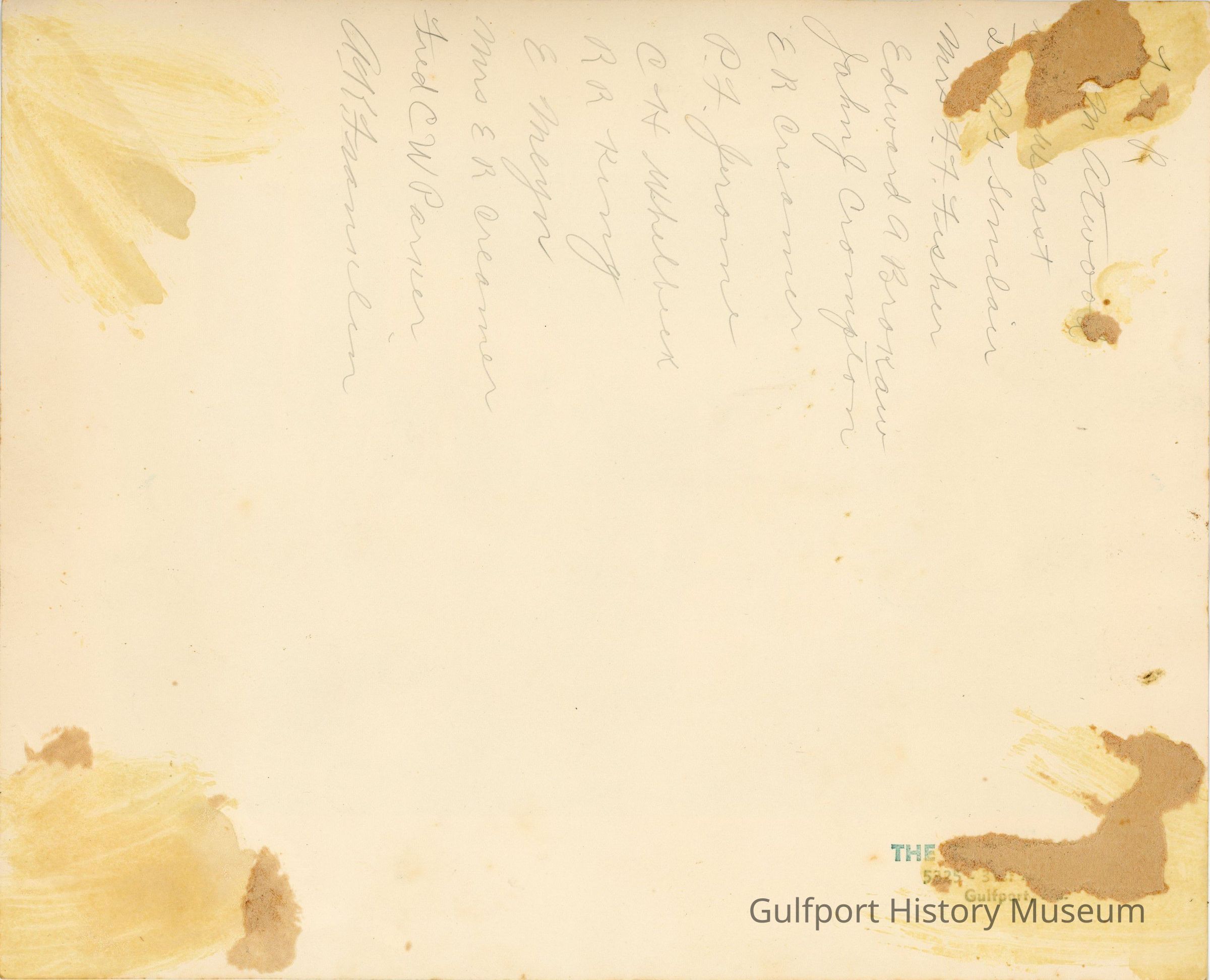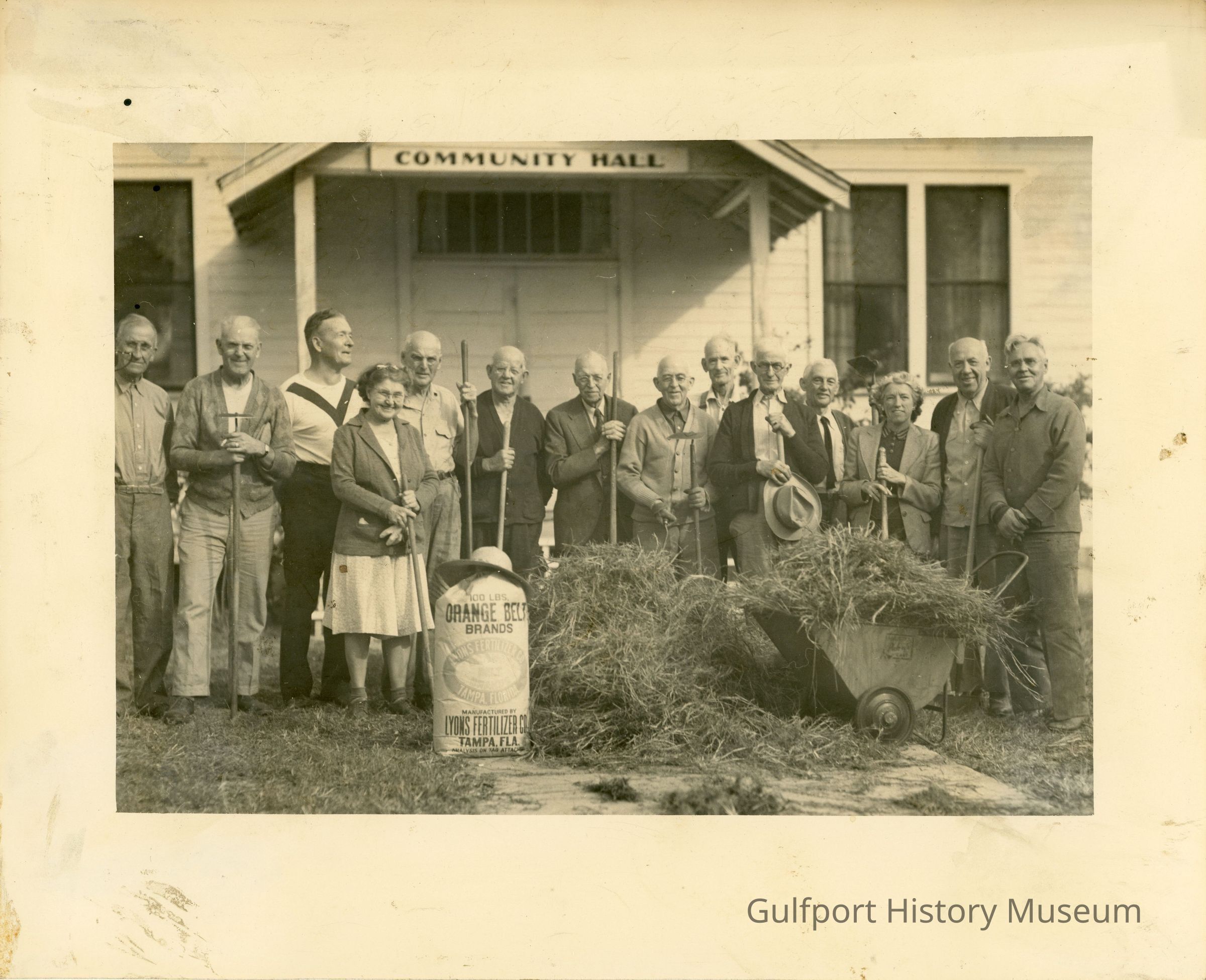 "Garden and Bird Club members ready to dig sandspurs around Community Hall in November, 1943. Atwood, Weast, Sinclair, Mrs. Fisher, Brokaw, Crompton, Creamer, Jerome, Whitbeck, King, Meyn, Mrs. Creamer, Parker, and Franklin."