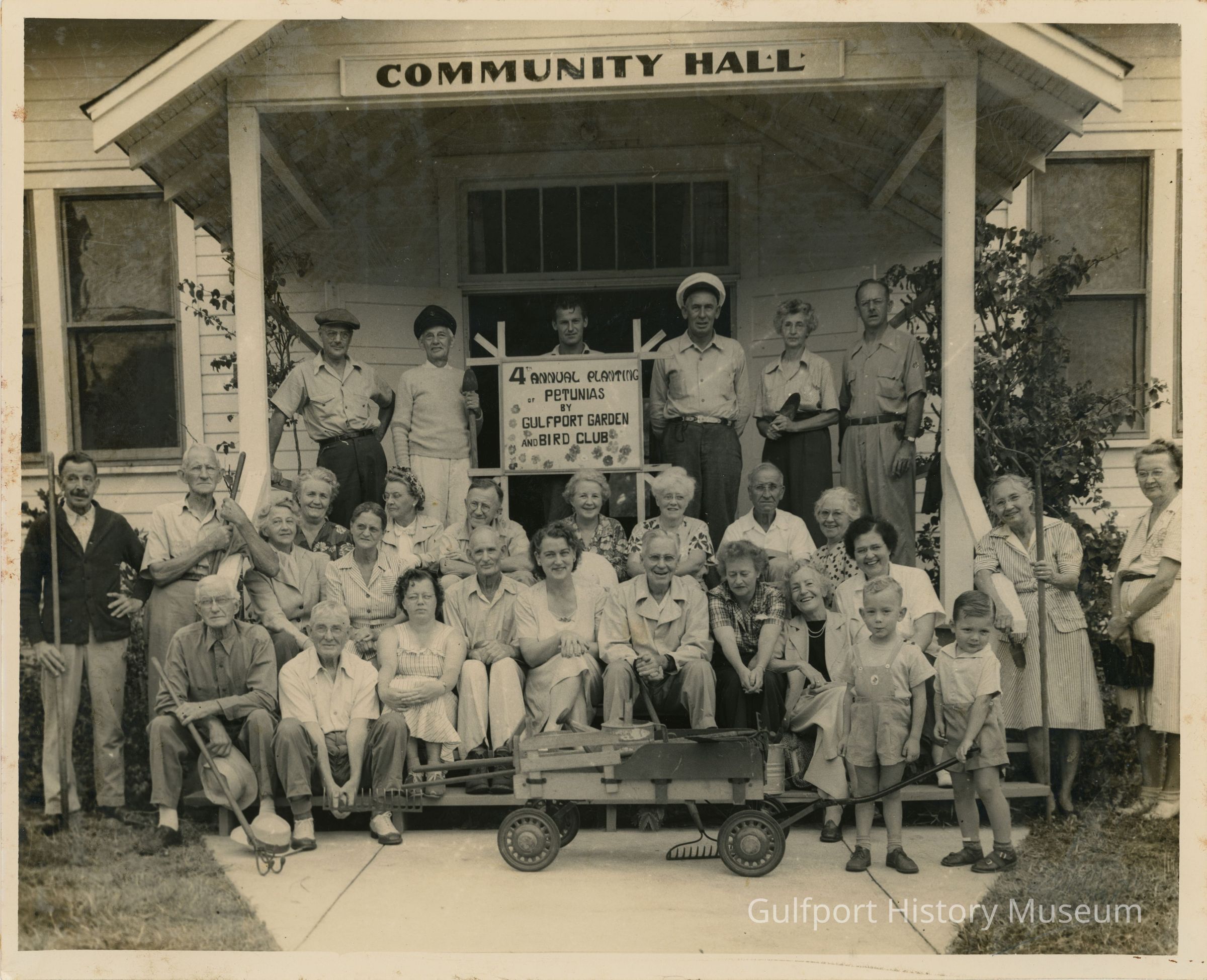A black and white photograph of the Gulfport Garden & Bird club on the porch of Community Hall (Scout Hall). There is a sign in the middle of the group which reads, "4th ANNUAL PLANTING OF PETUNIAS BY GULFPORT GARDEN AND BIRD CLUB." There is a wagon parked on the walkway near two children, one of which is holding the wagon's pull handle.