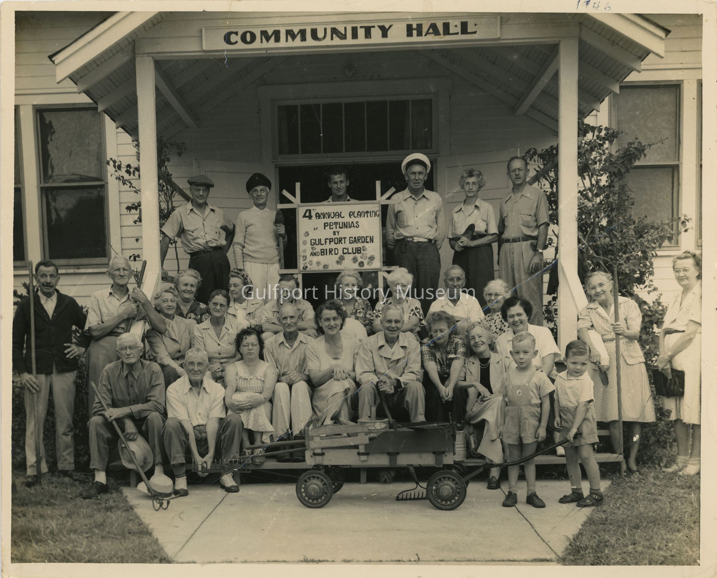 A black and white photograph of the Gulfport Garden & Bird club on the porch of Community Hall (Scout Hall). There is a sign in the middle of the group which reads, "4th ANNUAL PLANTING OF PETUNIAS BY GULFPORT GARDEN AND BIRD CLUB." There is a wagon parked on the walkway near two children, one of which is holding the wagon's pull handle.