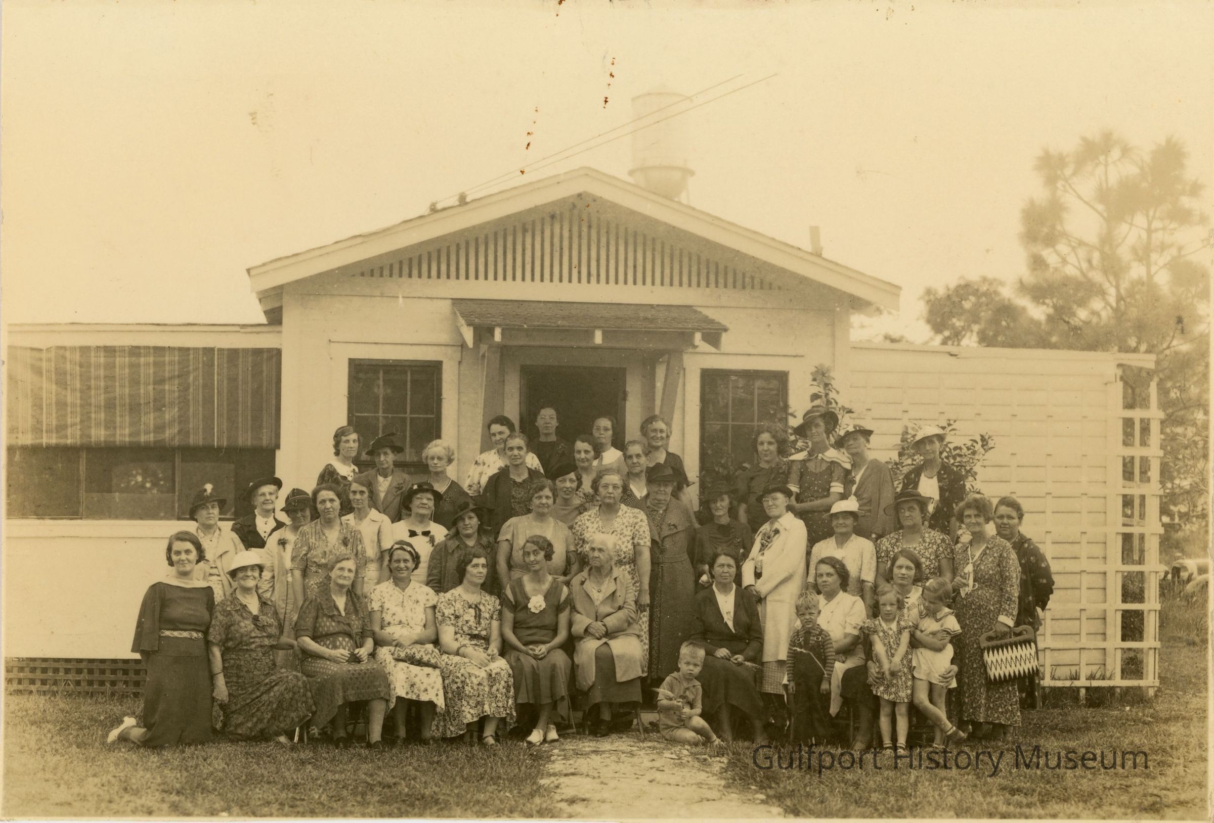 A black and white photograph postcard of the Home Demonstration Club posing in front of 5314 Lakeview Ave (5314 Gulfport Blvd). All of the members of the club are women in various day dresses and headwear. Four small children are at the front of the group. A water tower is visible in the far background above the house.Subject