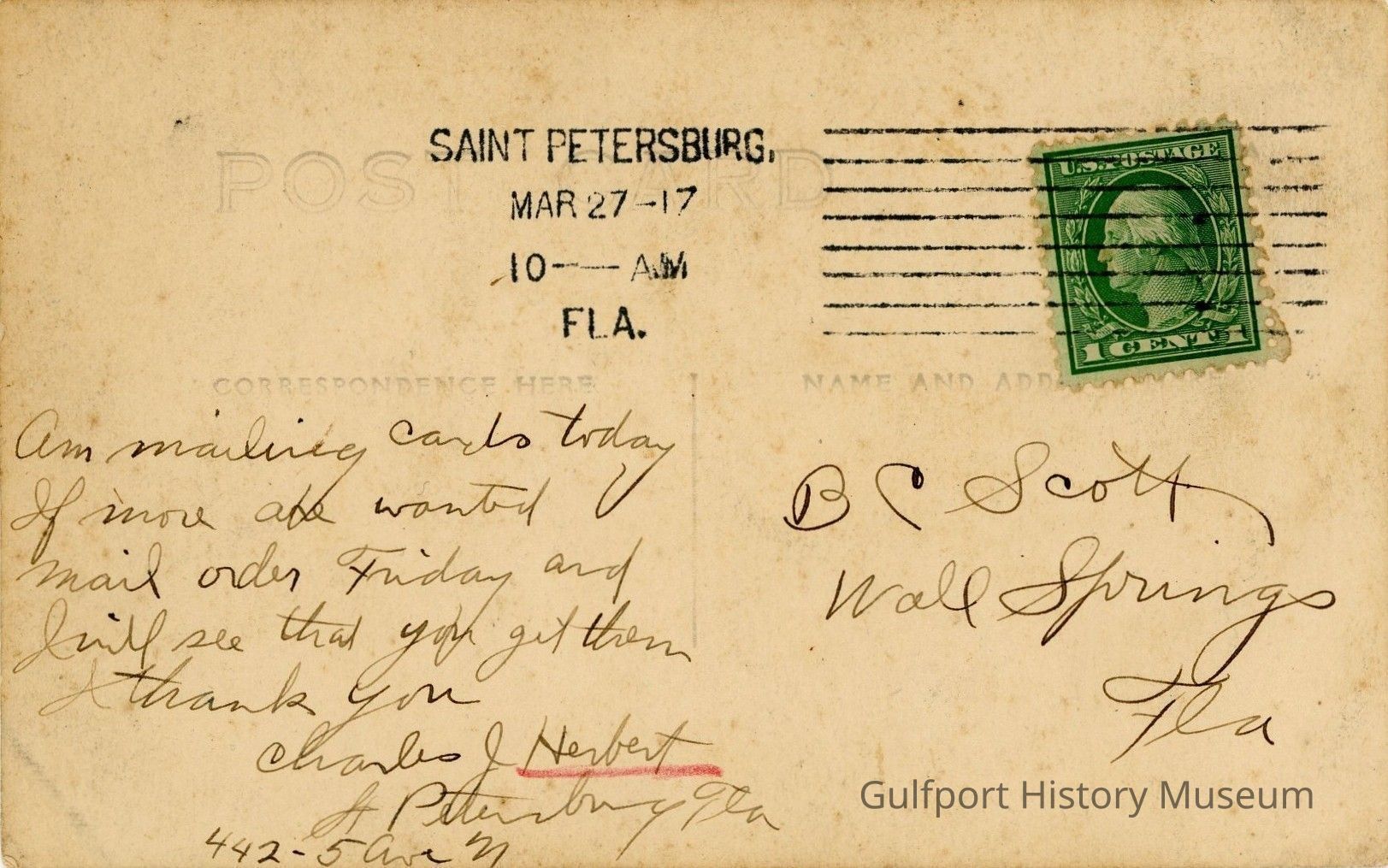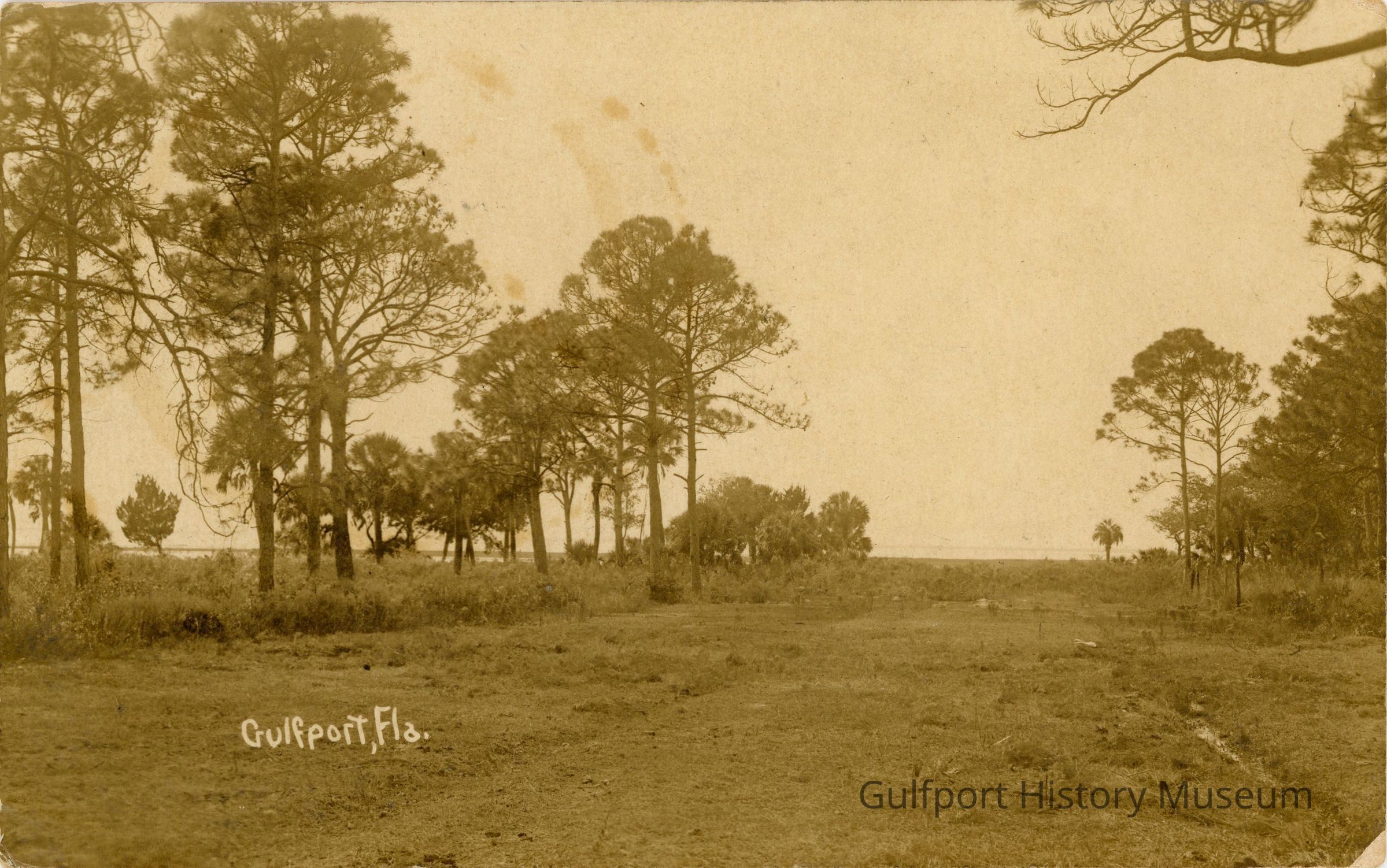 A black and white photograph postcard of a 1910s Gulfport landscape with trees by the shore of Boca Ciega Bay.