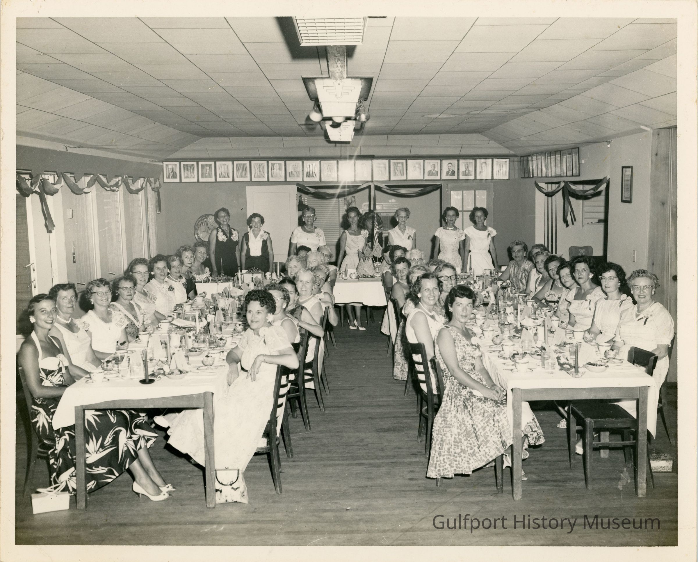 A black and white photograph of the Gulfport Lions Club Auxiliary seated at three tables all in semi-formal attire. The interior is decorated with streamers, and each table is lined with a white tablecloth and decorative candles. There is a Lions Club centerpiece at the center of the head table.