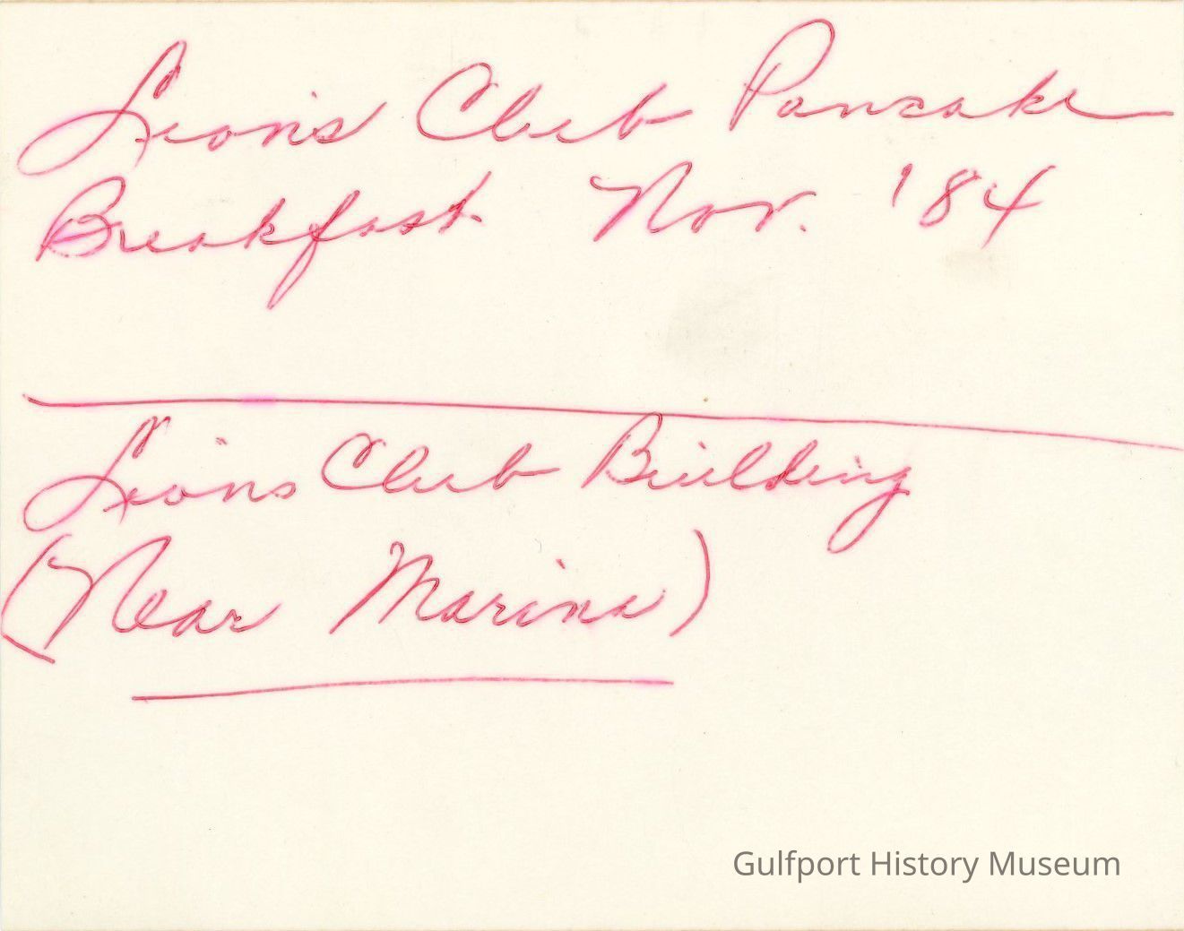 A color photograph of the Gulfport Lions Club building, located at 4630 Tifton Dr S. It is a red brick building with a flat roof and latticed front windows. Yellow letters that read "GULFPORT LIONS CENTER" are on the front. There are several cars parked in the lot. Boca Ciega Bay is visible behind the building.