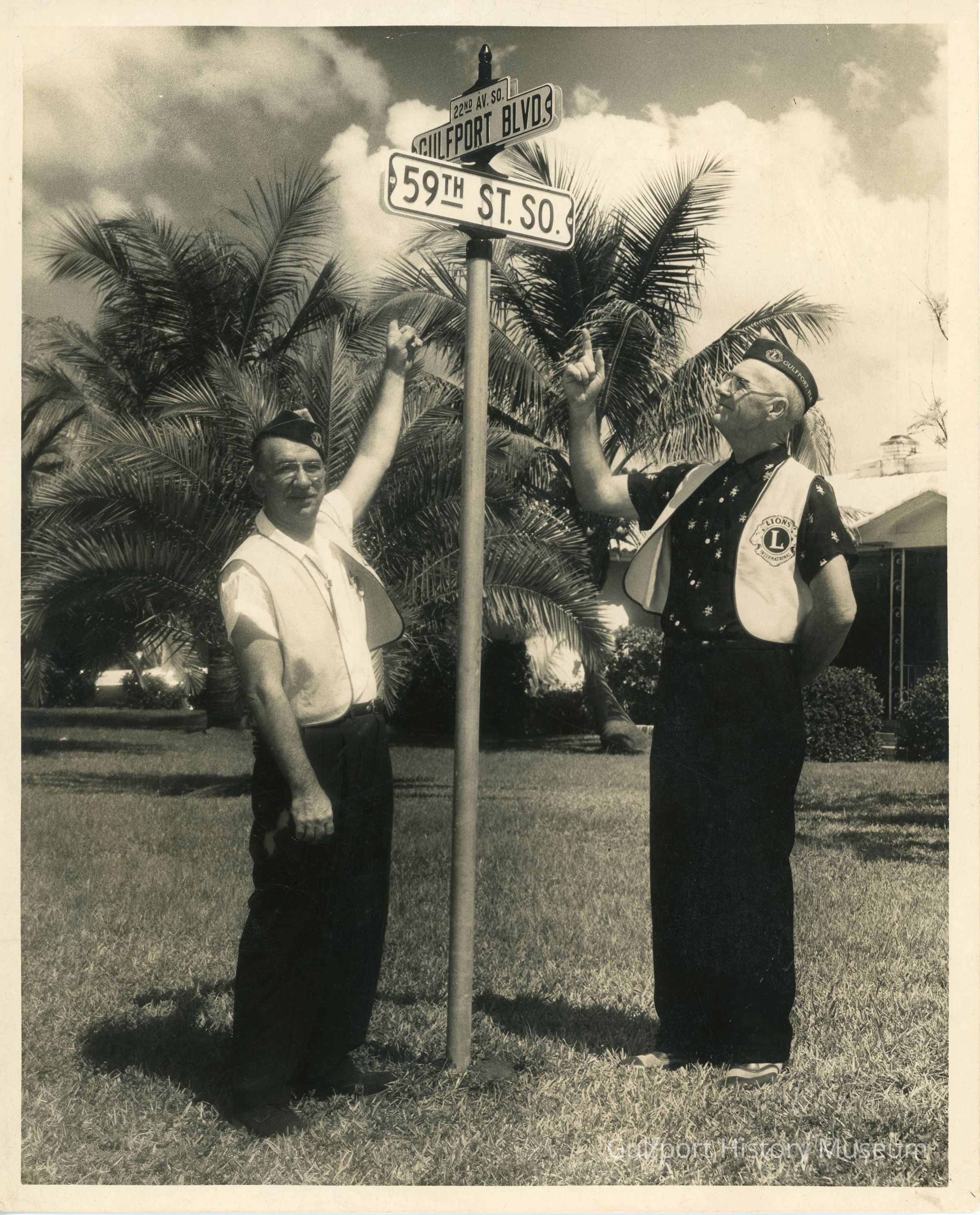 A black and white photograph of two men, members of the Gulfport Lions Club, standing by the street sign for the intersection of Gulfport Blvd (22nd Ave S) and 59th St S. They both wear Lions Club vests and hats. Both point upward toward the sign.