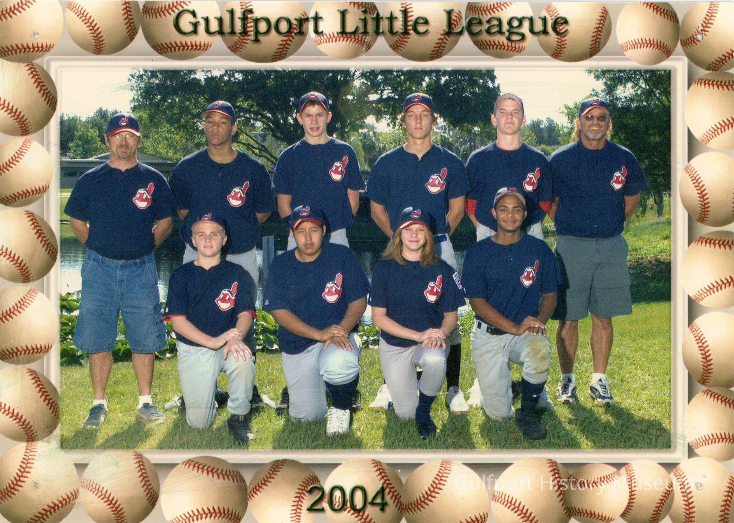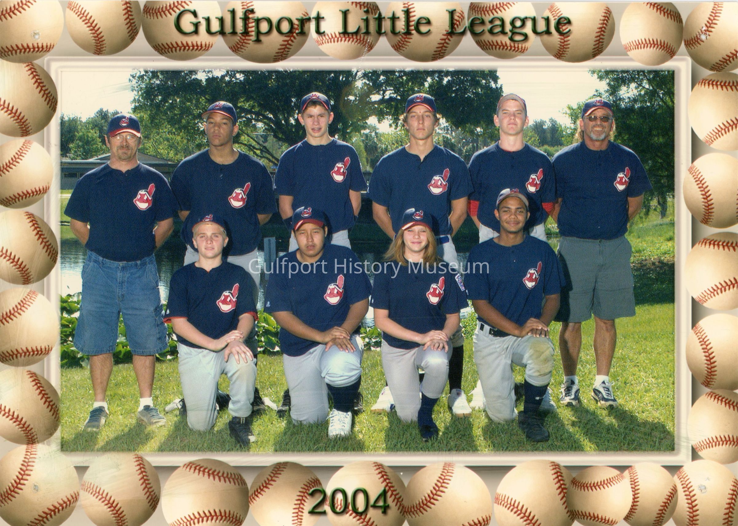 A color photograph of a little league team and their coaches. They are in two rows, with four people in the front kneeling, and six people in the back standing with their hands behind their backs. The photograph has a digital "frame" made from images of baseballs. Text on the top of the "frame" says "Gulfport Little League," and text on the bottom reads "2004."