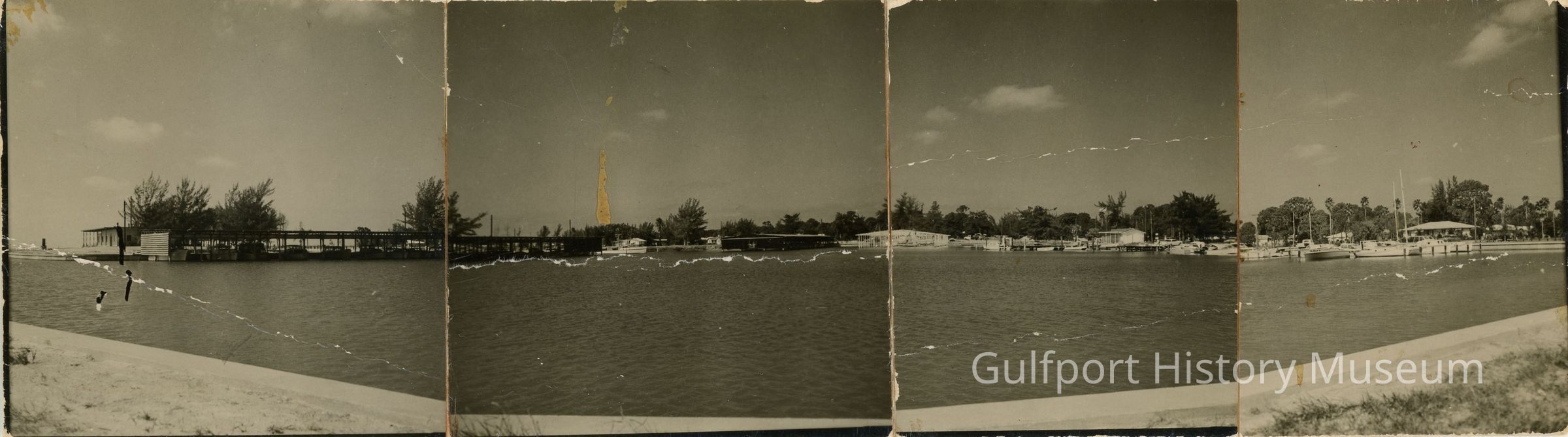 A panoramic strip of four black and white photographs of the Gulfport Marina.