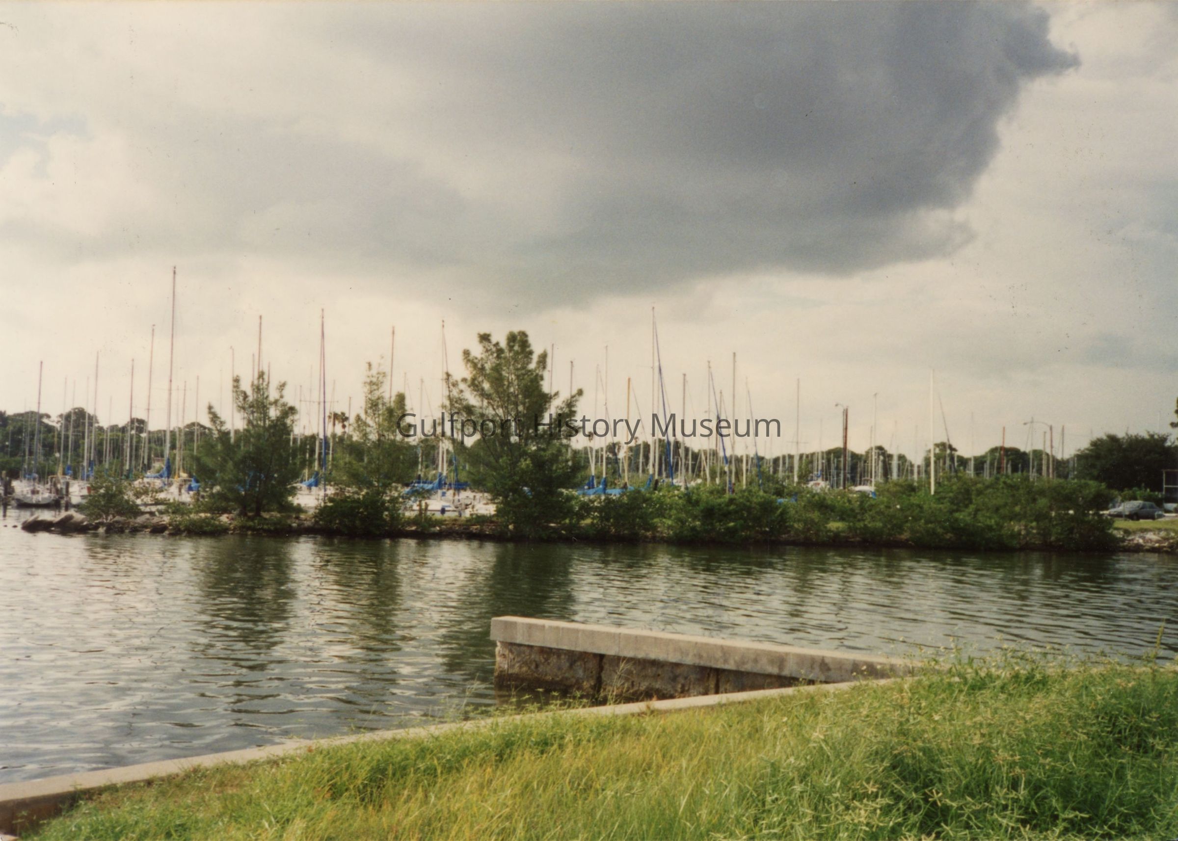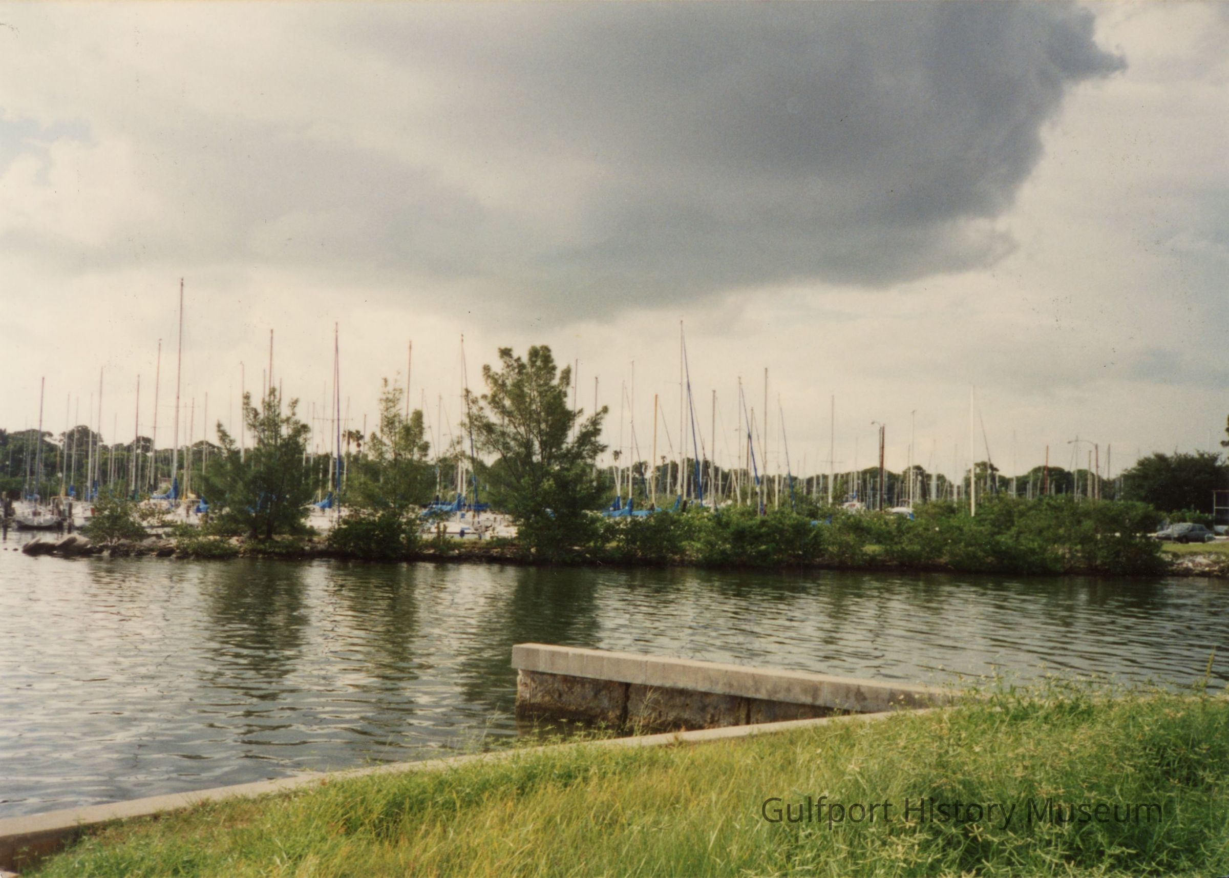 A color photograph of the Gulfport Marina on an overcast day. There are several sailboats behind some foliage, but only the masts are visible.