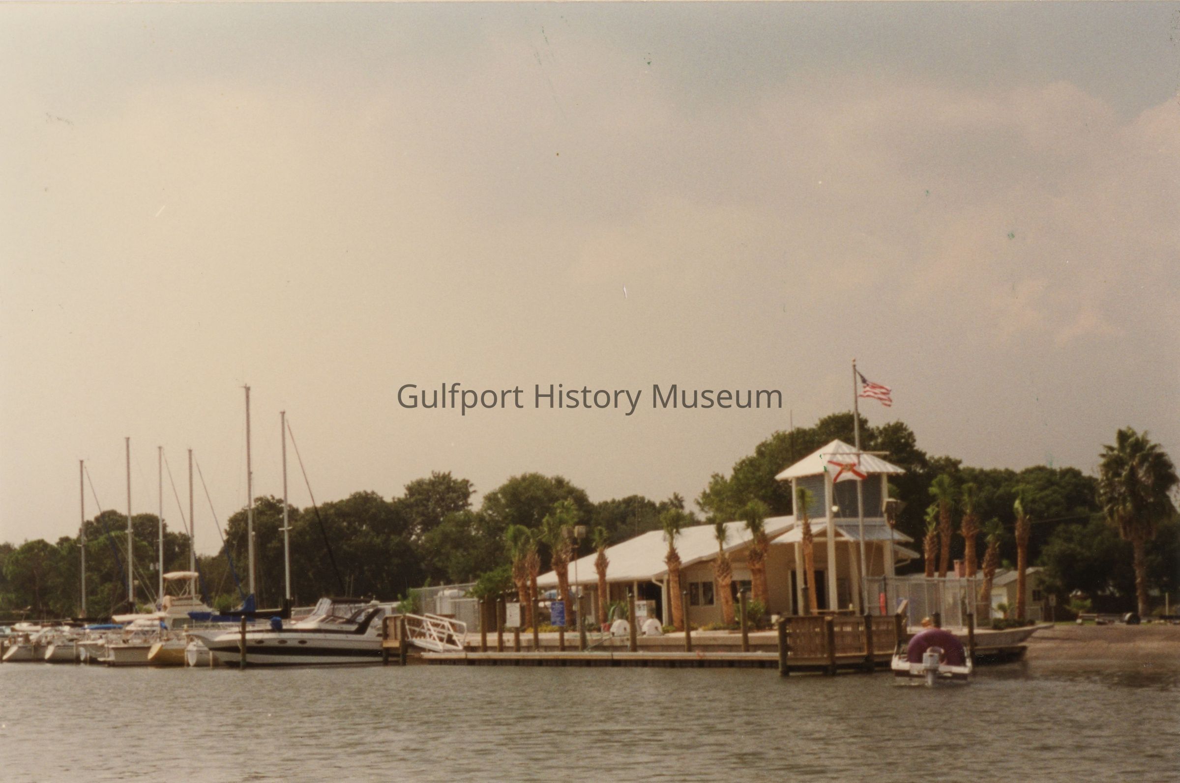 A slightly faded color photograph of several sailboats docked at the Gulfport Marina in front of the marina building.