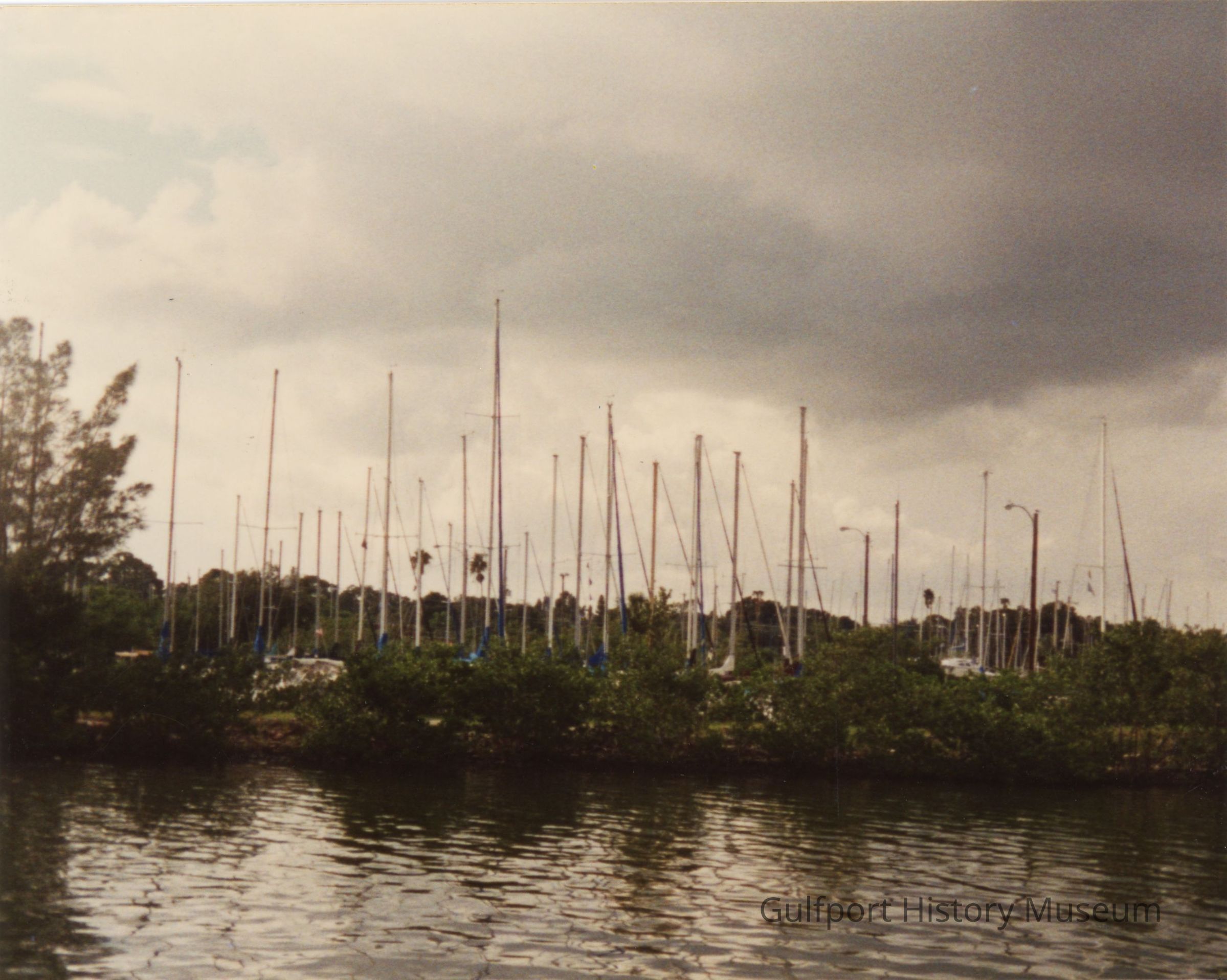 A color photograph of the Gulfport Marina on an overcast day. There are several sailboats behind some foliage, but only the masts are visible.
