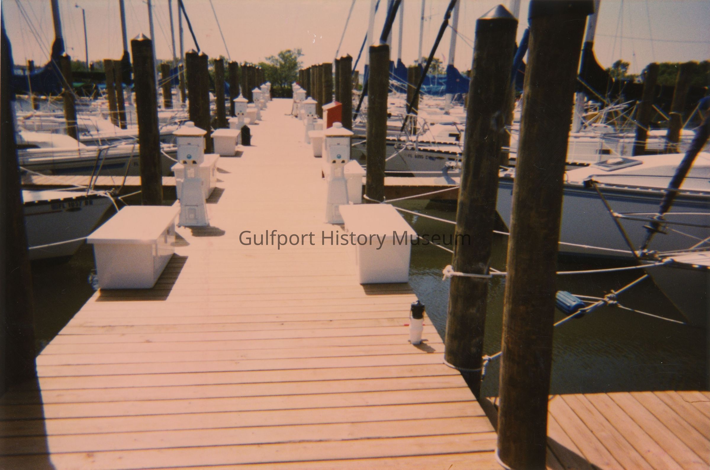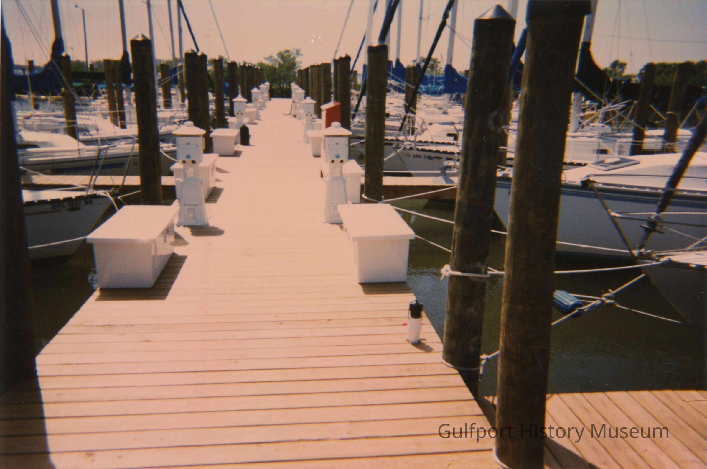 A color photograph of sailboats docked at the Gulfport Marina. Various storage boxes and containers line the dock.