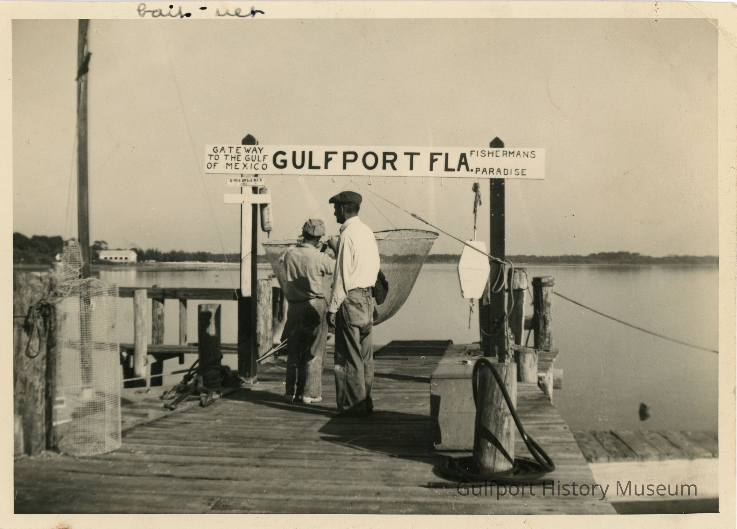 A black and white photograph of two men standing at the end of the Gulfport Pier. One of them is inspecting a large net. The sign above them reads "GATEWAY TO THE GULF OF MEXICO GULFPORT FLA. FISHERMANS PARADISE". Handwriting in ink at the top of the page may read: "bait-net."
