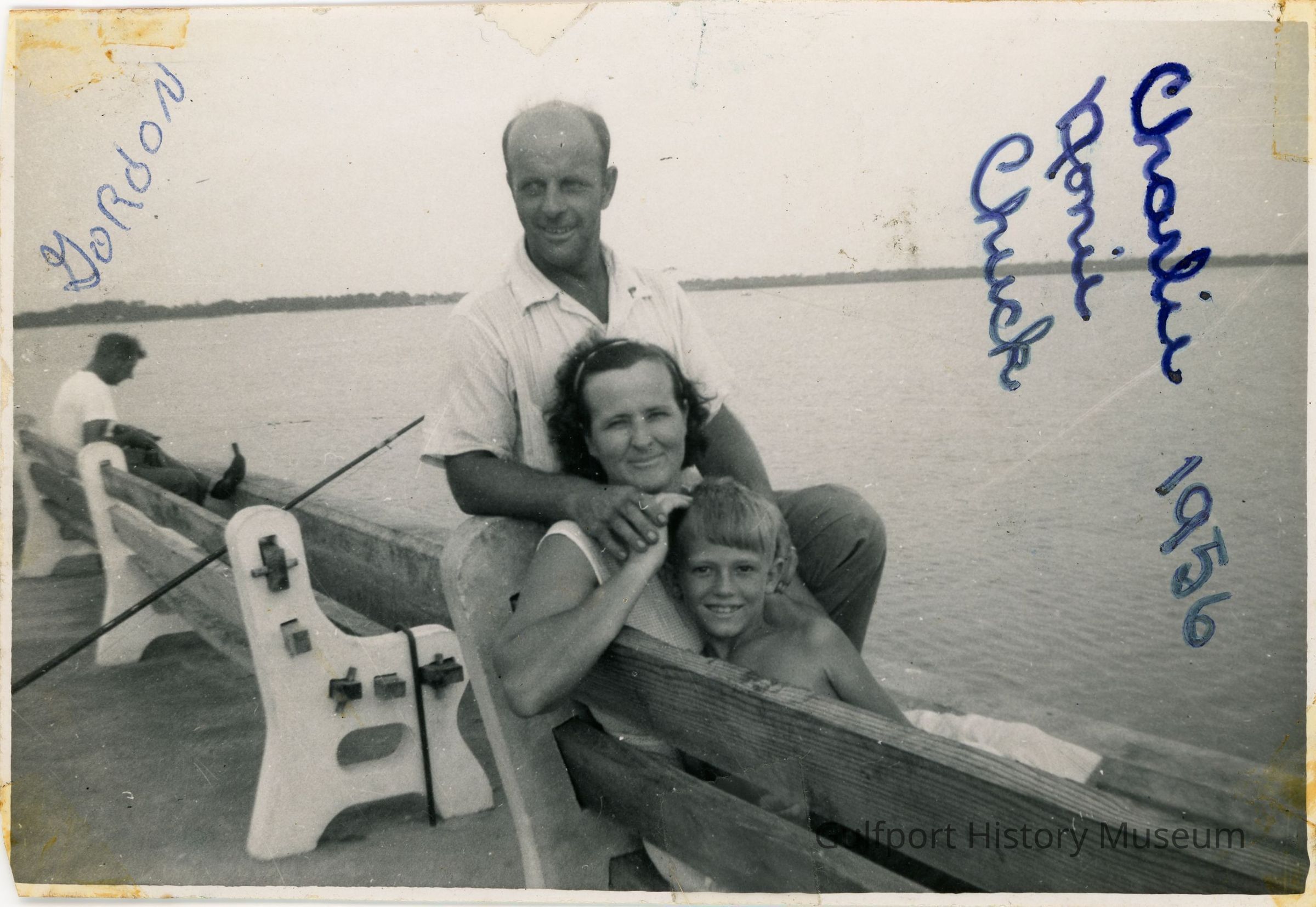 A black and white photograph of a family sitting on a bench on the Gulfport Pier. A man standing behind the bench rests his hand on a woman's shoulder while looking at something behind the camera. In front of him are the woman and a young boy who are both looking at the camera and smiling. In the background, a man sits on a bench and faces the water. There is writing on the front of the photograph in blue ink. This writing identifies the people on the bench as Charlie, [?], and Chuck. It also says "Gordon" above the man in the background, and "1956" below the three names.