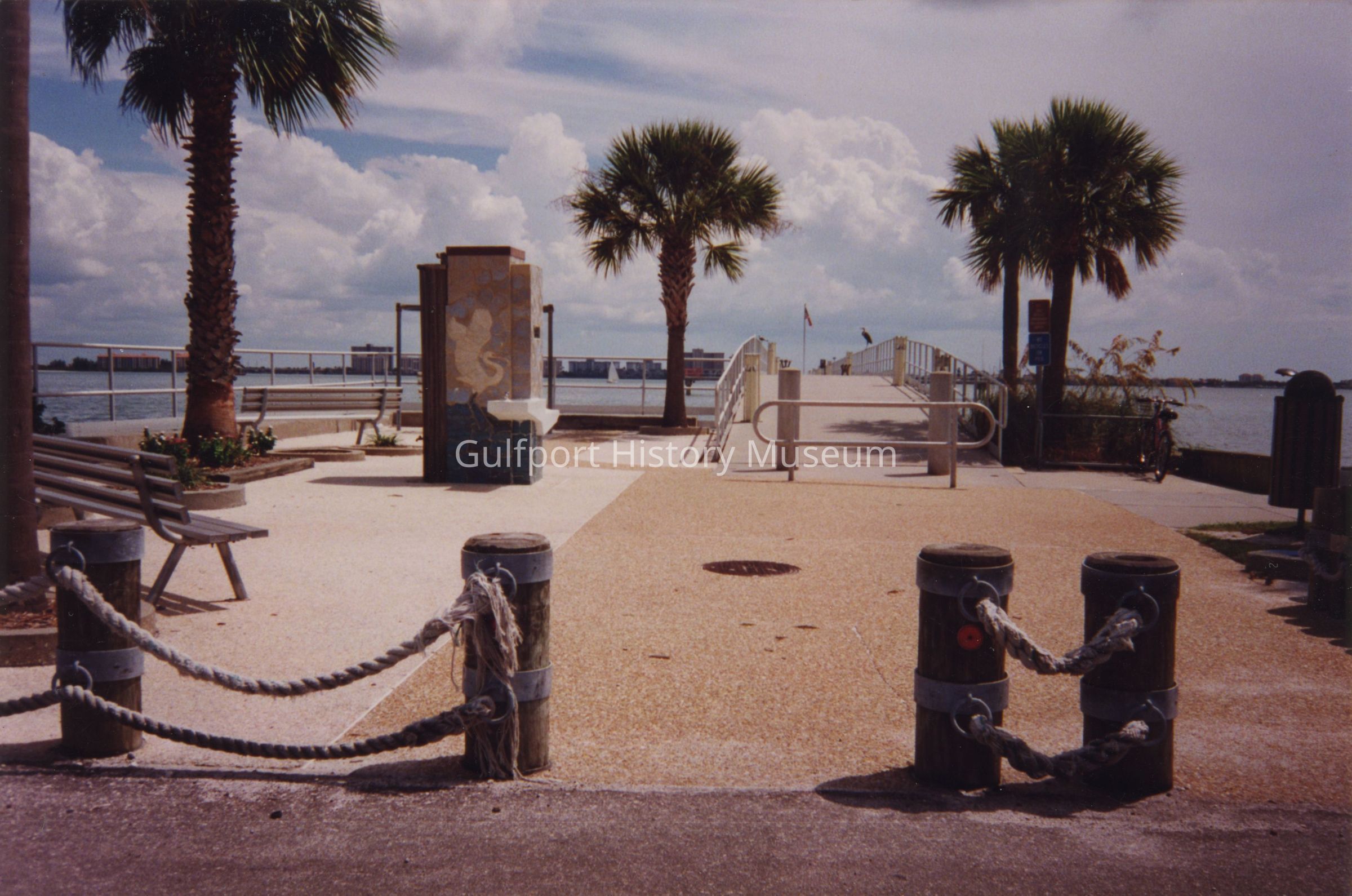 A color photograph of the entrance to Gulfport Pier. The entrance is surrounded by various posts to block automobile traffic, as well as benches and palm trees.