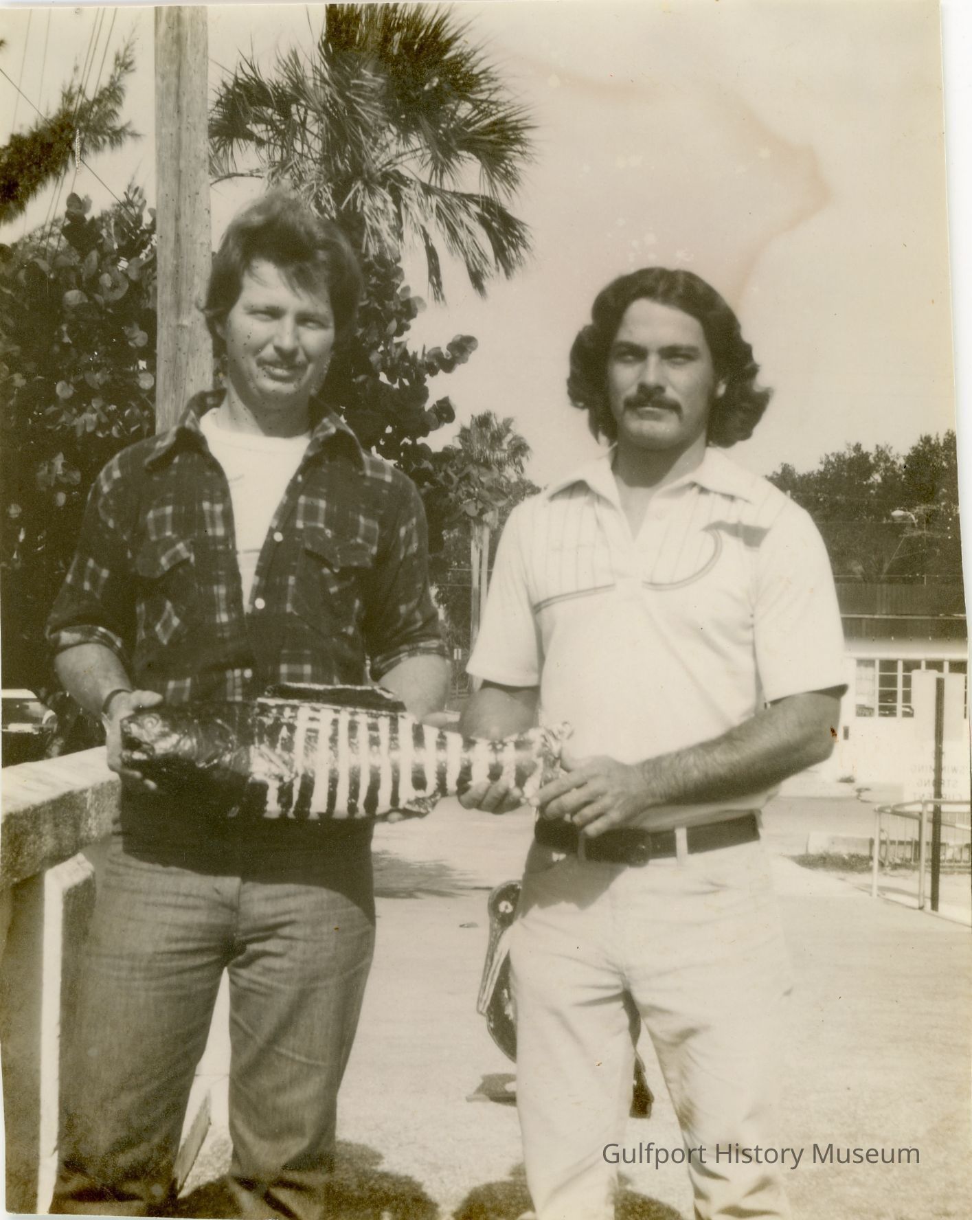 A black and white mirrored photograph of Ted Fussell and Hillary Skillen standing on Gulfport Pier holding a fish prop.